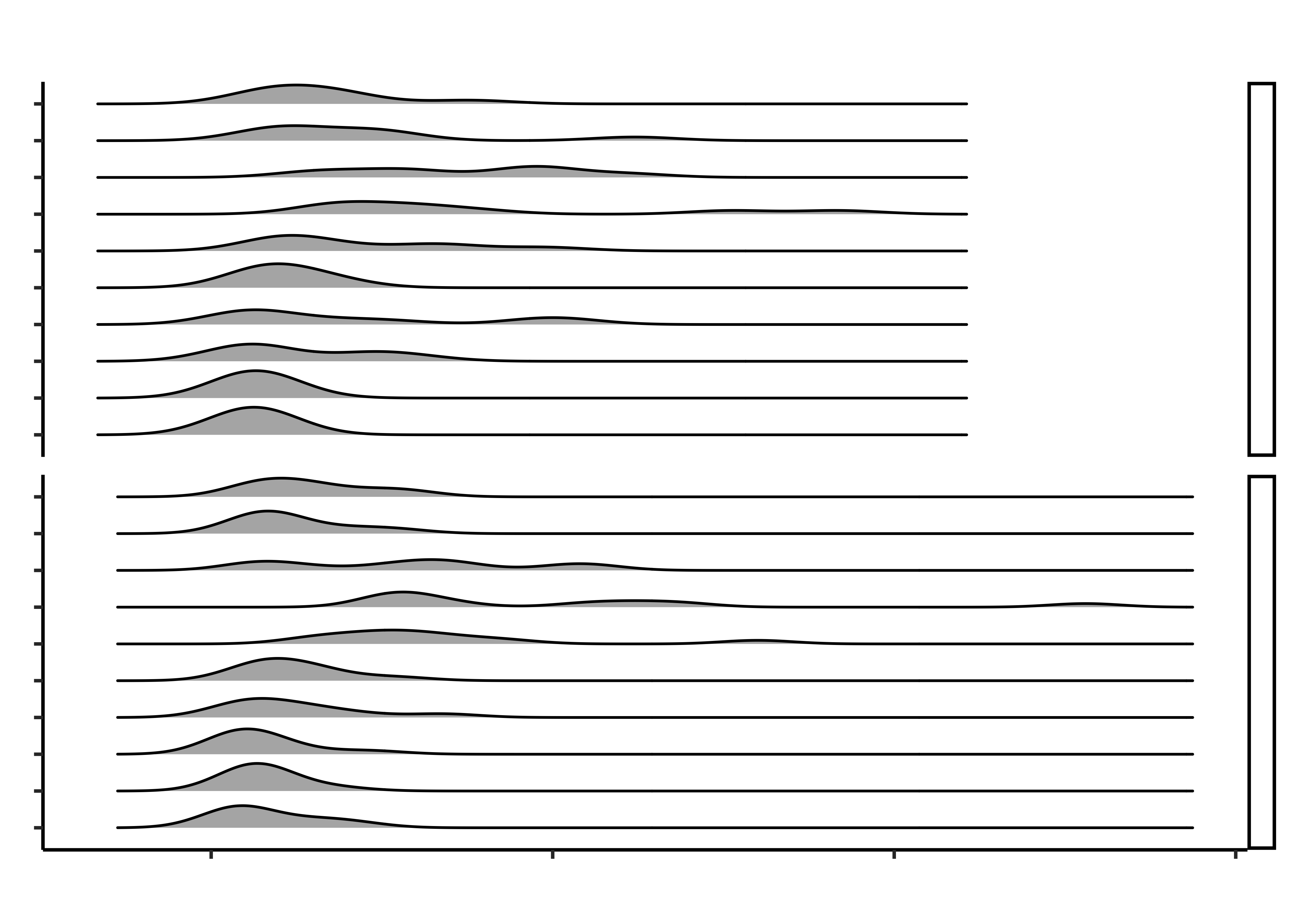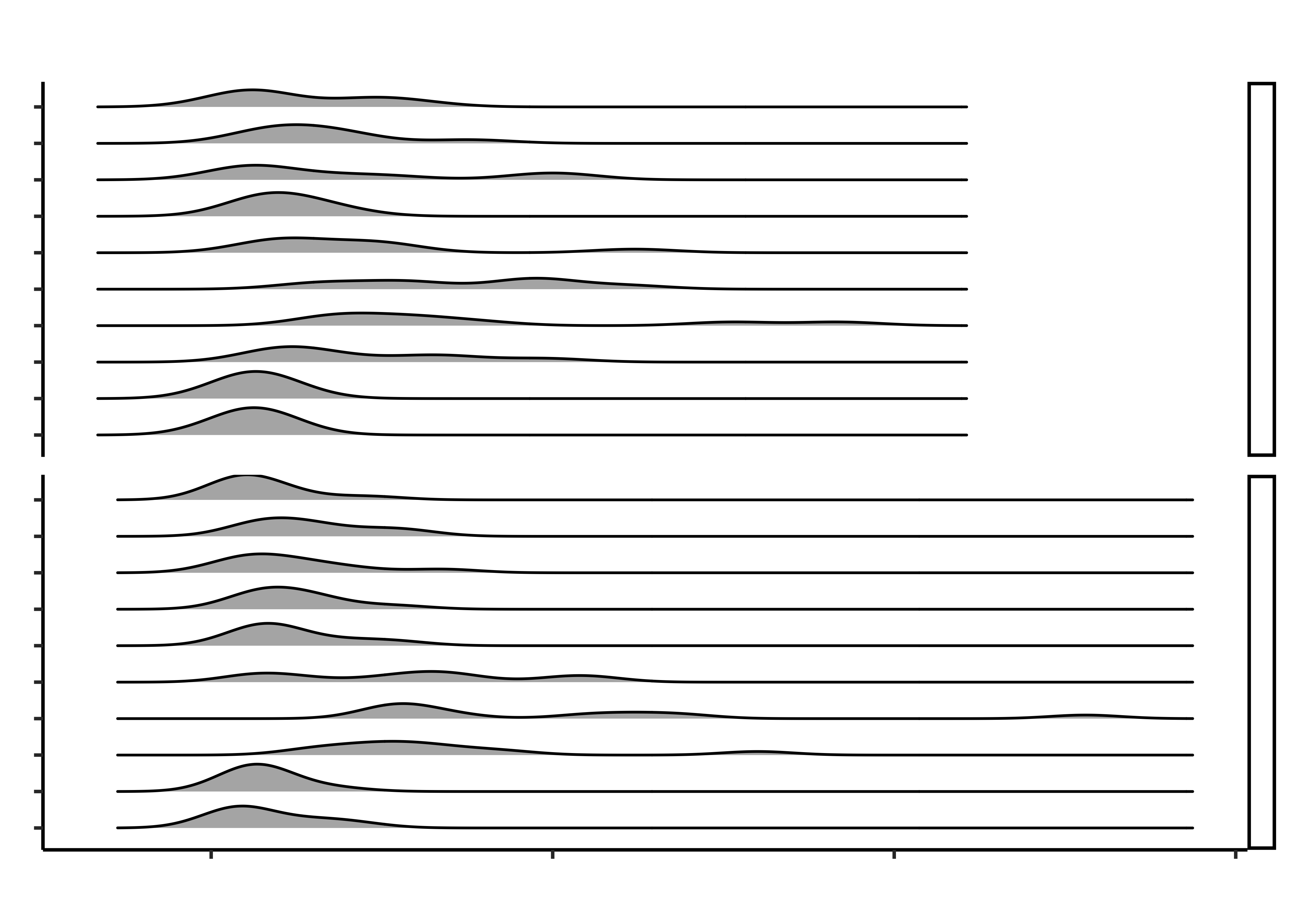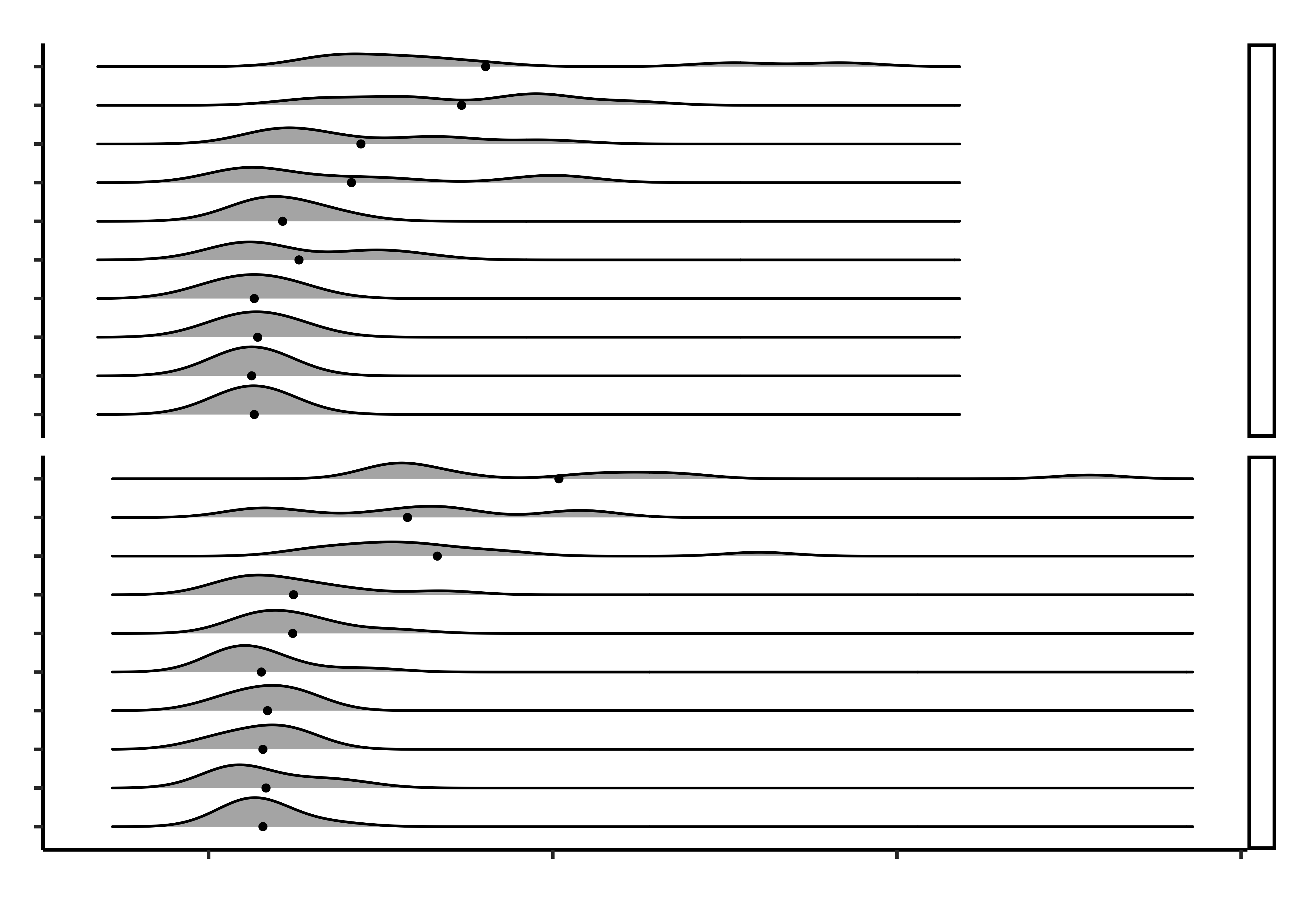 - What is the kind of plot used in the chart? A facetted ridge plot with medians marked using points