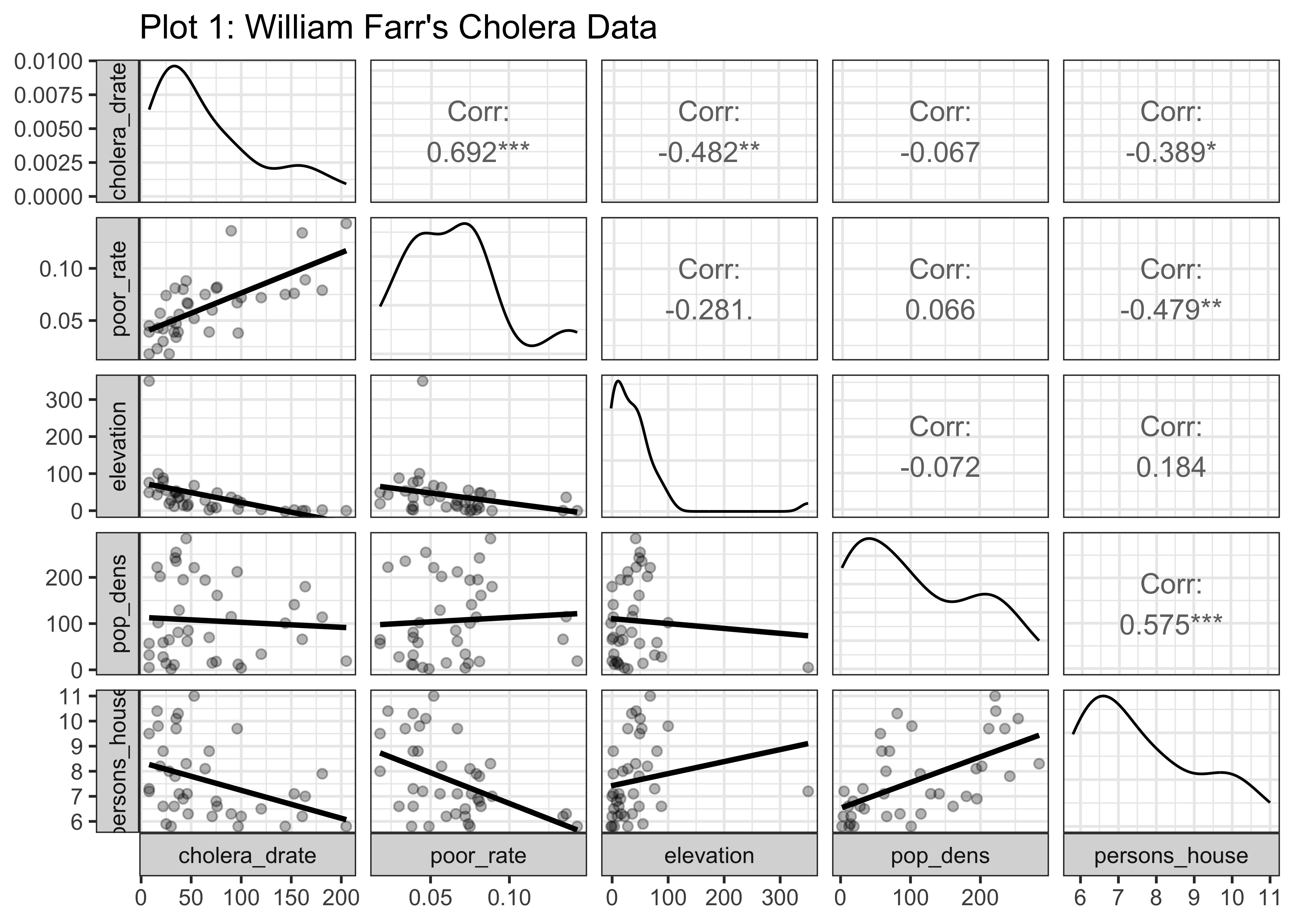 John Snow’s contention that cholera was principally spread by water was not accepted in the 1850s by the medical elite. The consequence of rejection was that hundreds in the UK continued to die. William Farr, who founded the science of epidemiology, tried to examine if there were other causes that led to cholera. He had concluded that the available data not only supported miasma (spread via atmospheric vapours) but also indicated that there was an underlying ‘natural law’ linking infection with cholera inversely to elevation above high water. The data is available on Vincent Arel-Bundock’s website, and is part of the HistData package from Michael Friendly, UC Davis.