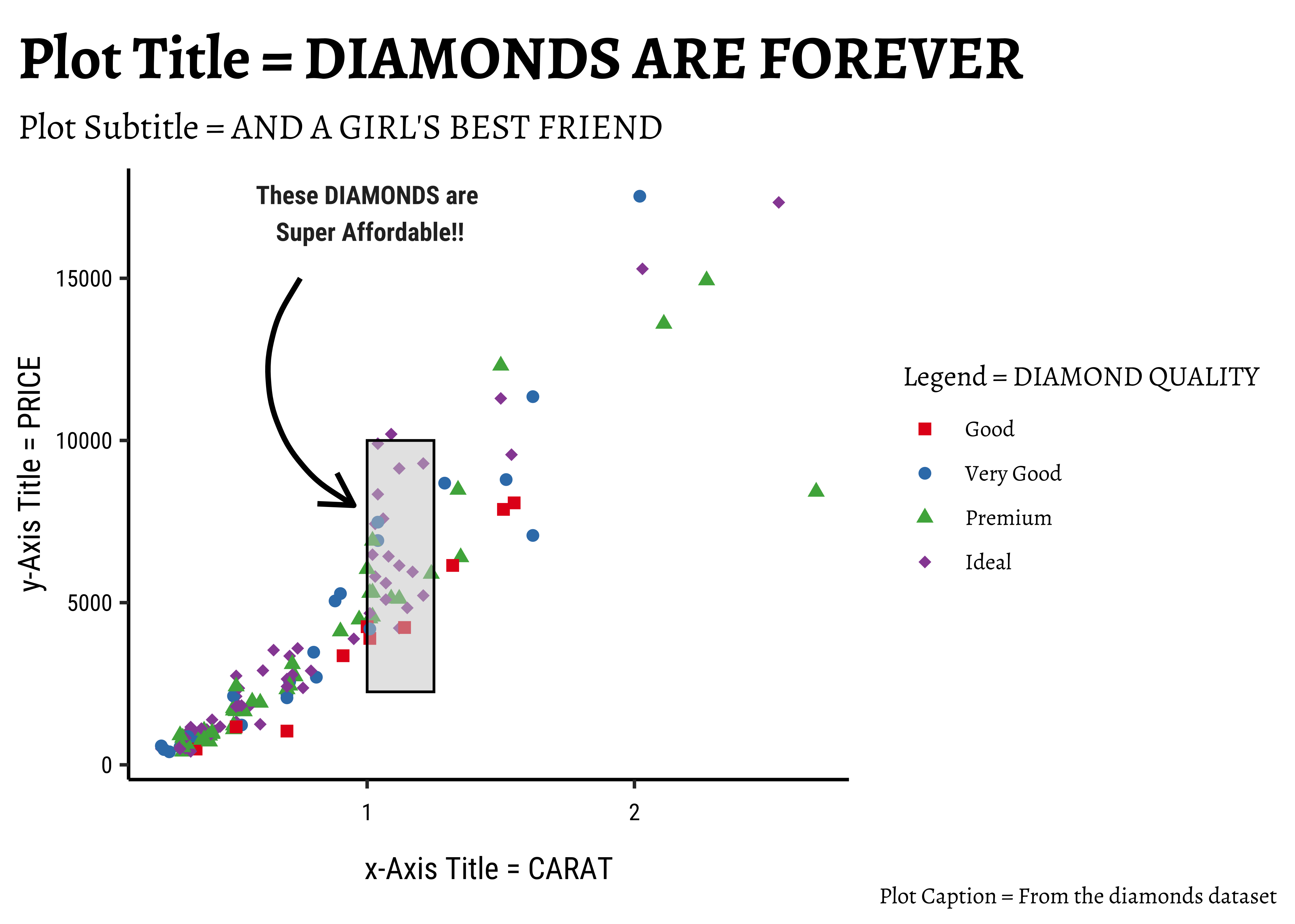 In the above chart, it is pretty clear what kind of variable is plotted on the x-axis and the y-axis. What about colour? Could this be considered as another axis in the chart? There are also other aspects that you can choose (not explicitly shown here) such as the plot theme(colours, fonts, backgrounds etc), which may not be mapped to data, but are nonetheless choices to be made. We will get acquainted with this aspect as we build charts.