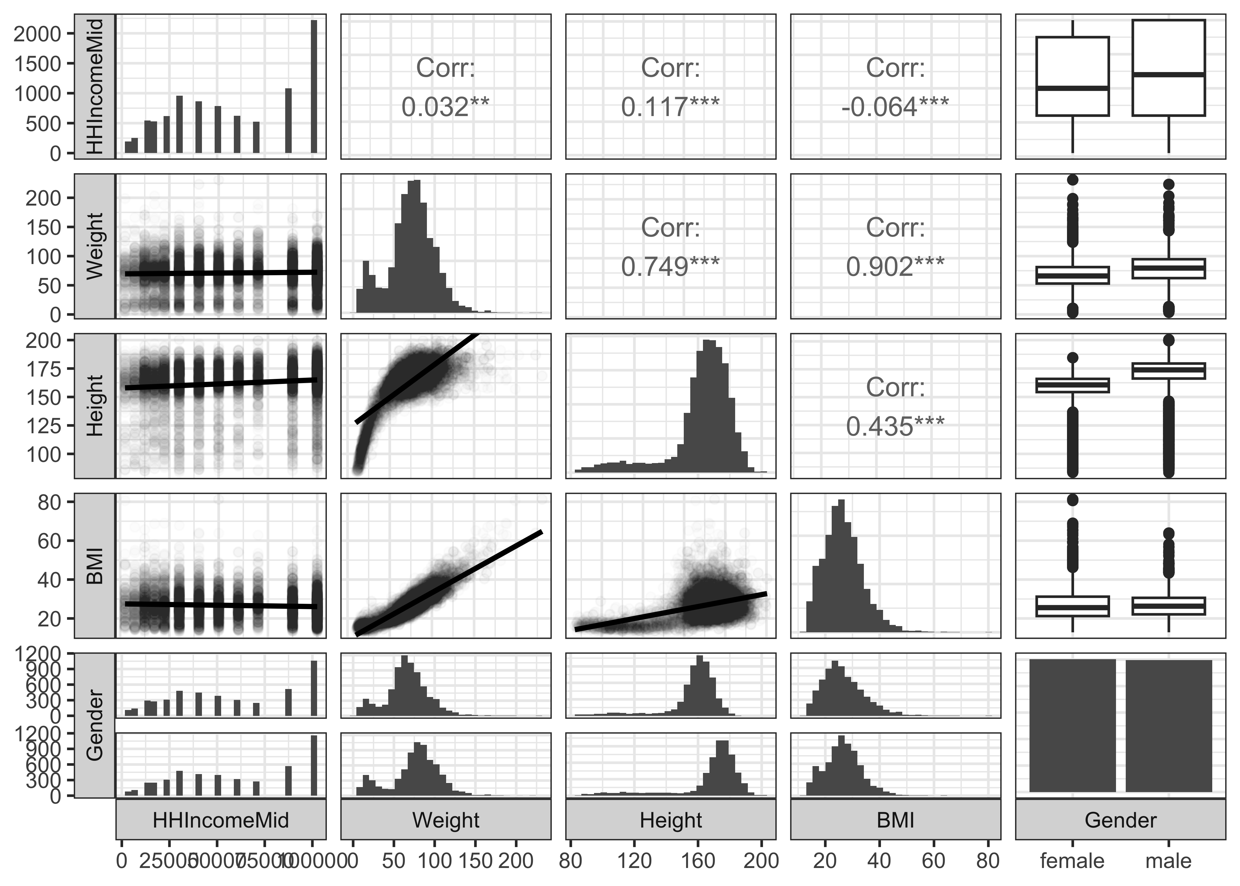 theme_bw()We see that HHIncomeMid is Quantitative, discrete valued variable, since it is based on a set of median incomes for different ranges of income. BMI, Weight, Height are continuous Quant variables.