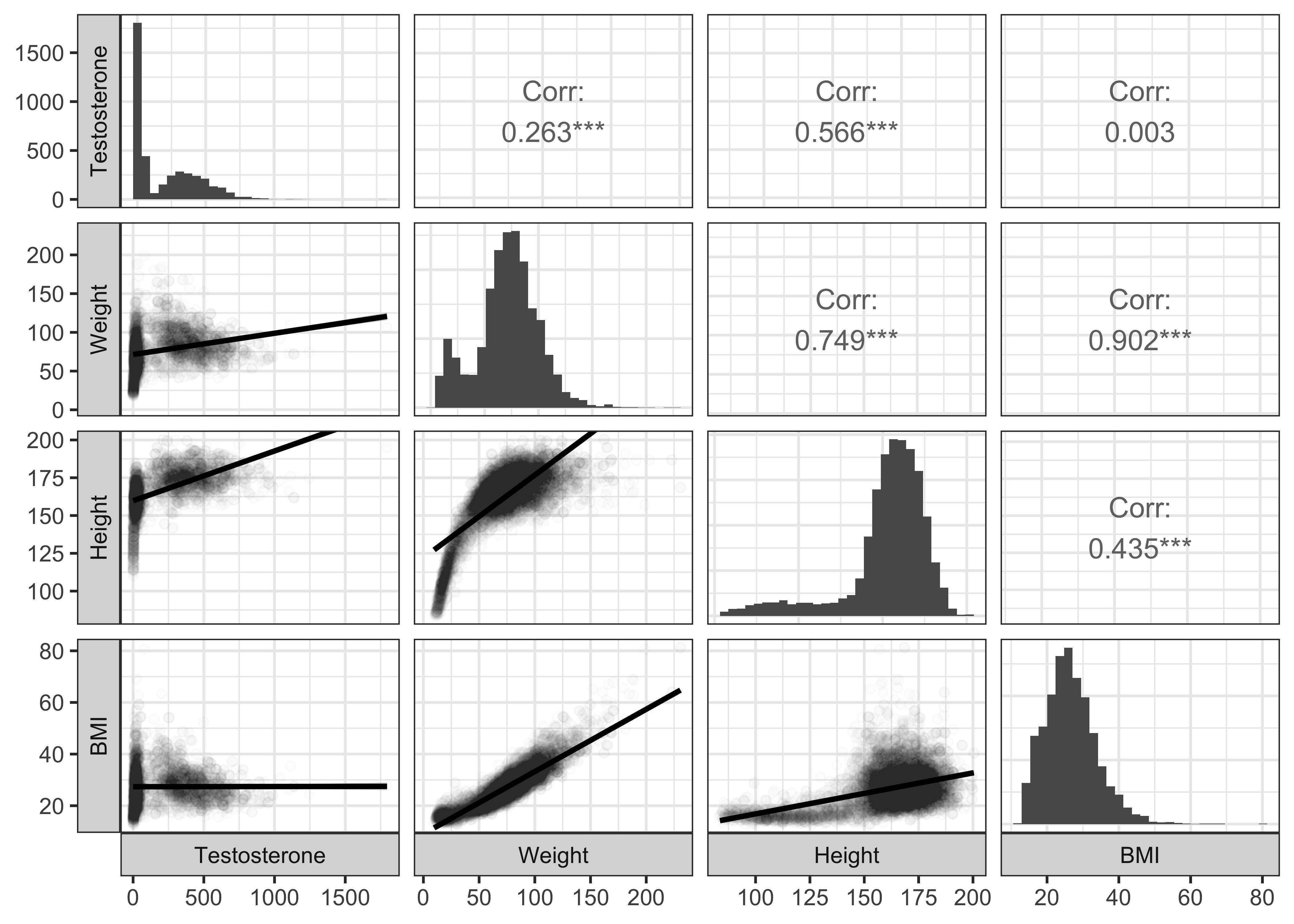 It is clear that Testosterone has strong relationships with Height and Weight but not so much with BMI.