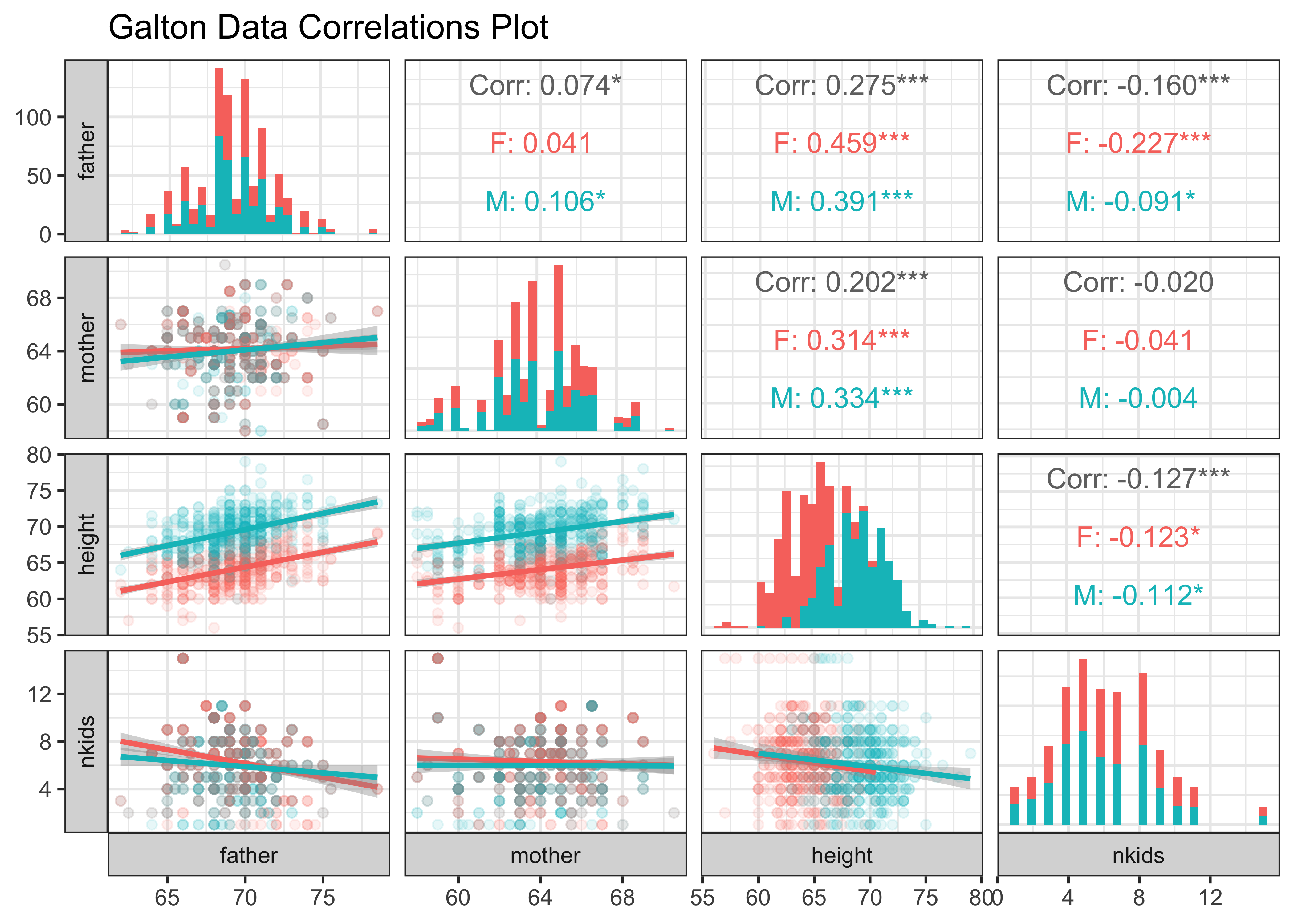 theme_bw()The split scatter plots are useful, as is the split histogram for height: Clearly the correlation of childrenβs height with father and mother is positive for both sex-es. The other plots, and even some of the correlations scores are not all useful! Just shows everything we can compute is not necessarily useful immediately.