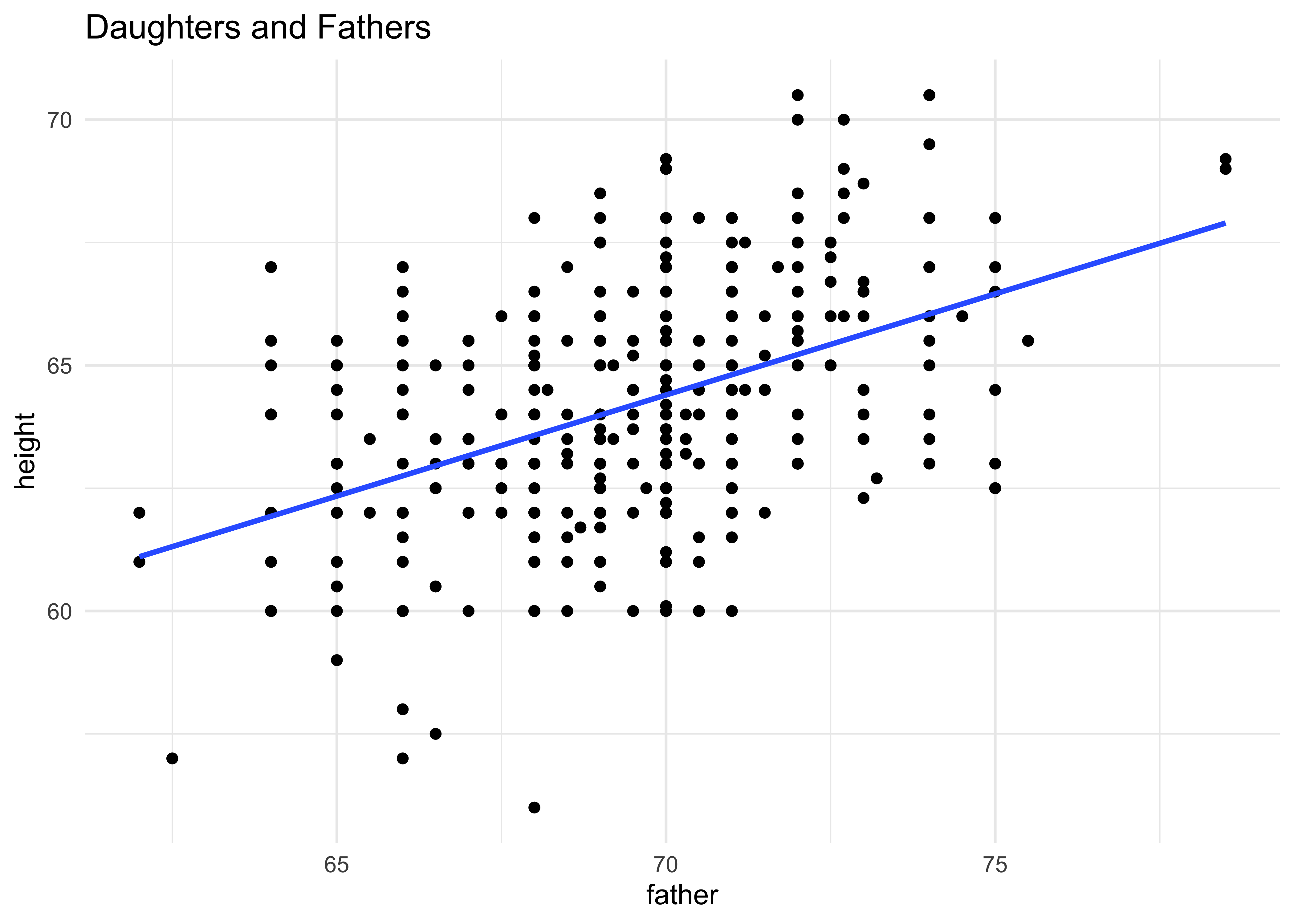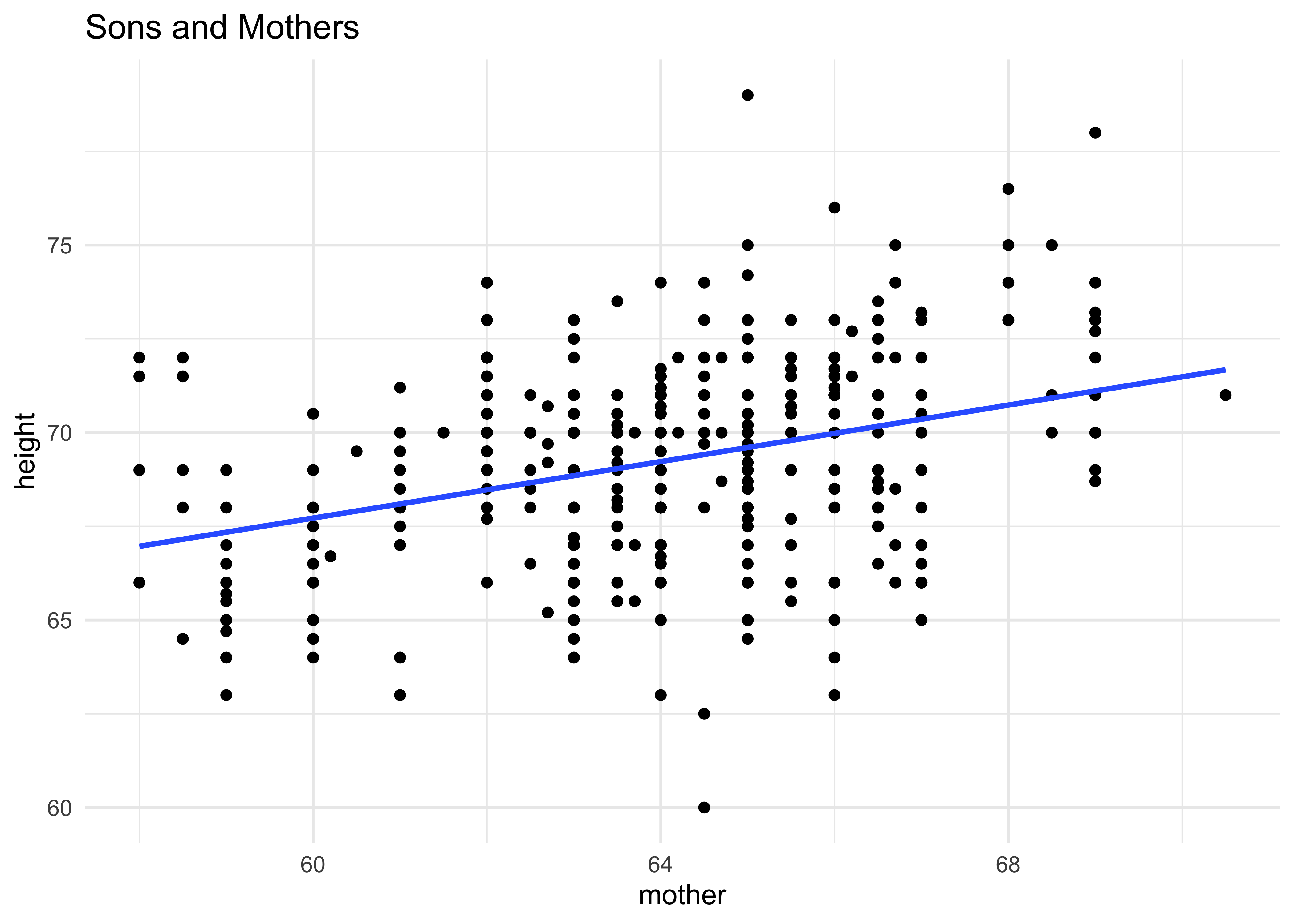 theme_bw()We note that childrenβs height is correlated with that of father and mother. The correlations are both positive, and that with father seems to be the larger of the two. ( Look at the slopes of the lines and the values of the correlation scores. )