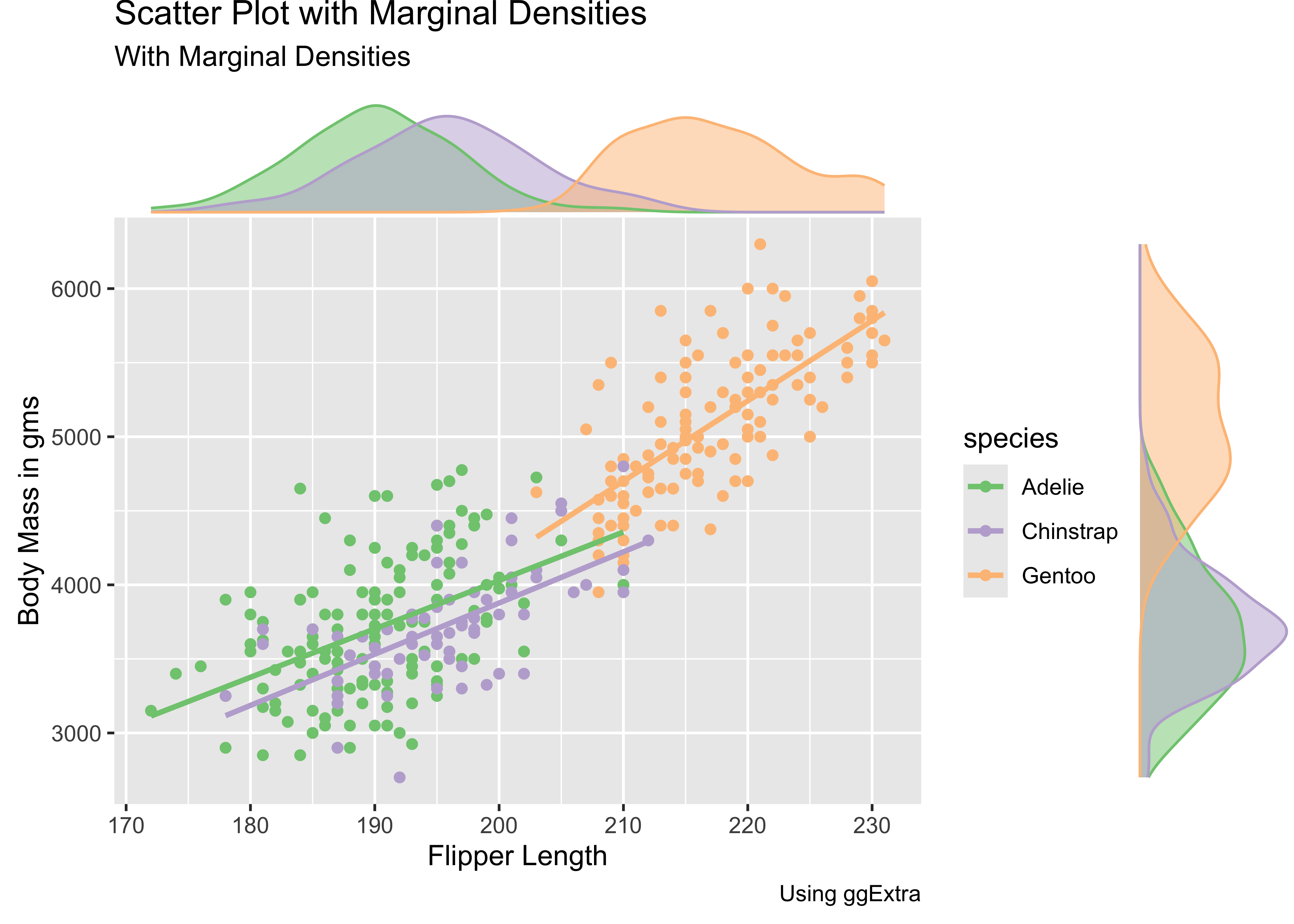 gf_labs(x = "Flipper Length", y = "Body Mass in gms", title = "Penguins Scatter Plot", subtitle = "With Marginal Densities", caption = "Using ggExtra") %>%