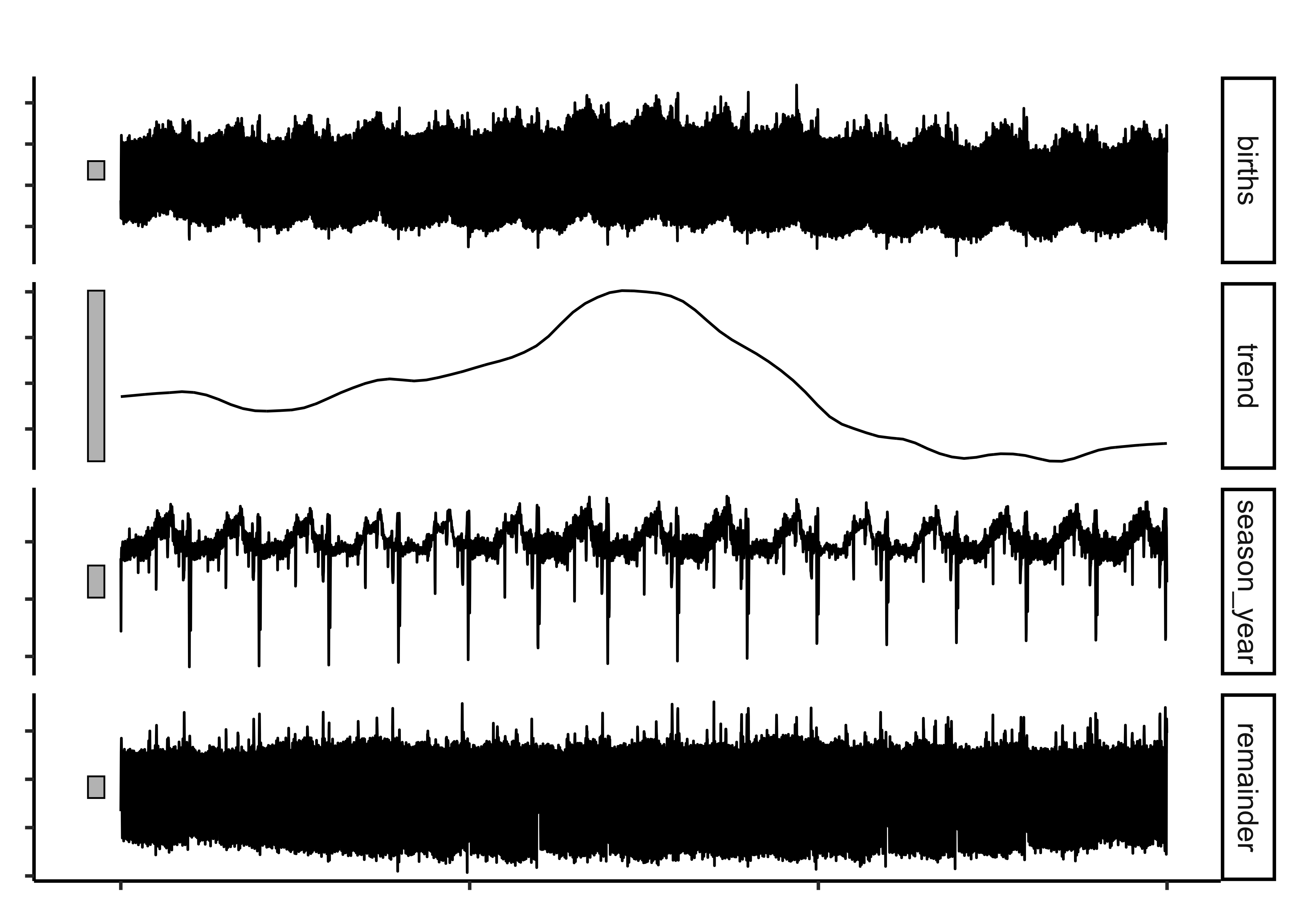 fabletools::components(births_STL_yearly).model <chr> | index <date> | births <dbl> | trend <dbl> | season_year <dbl> | remainder <dbl> | season_adjust <dbl> |