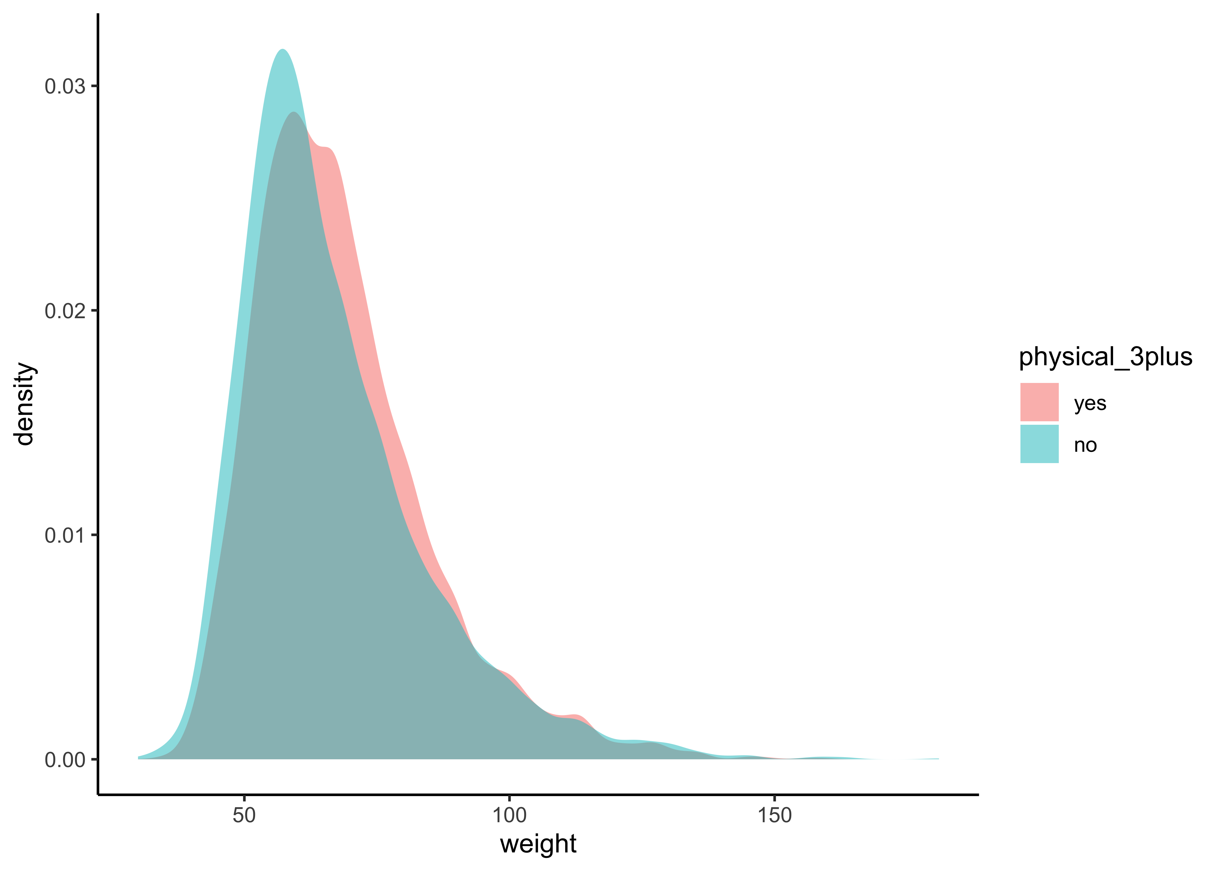 gf_theme(theme_classic())The box plots show how the medians of the two distributions compare, but we can also compare the means of the distributions using the following to first group the data by the physical_3plus variable, and then calculate the mean weight in these groups using the mean function while ignoring missing values by setting the na.rm argument to TRUE.