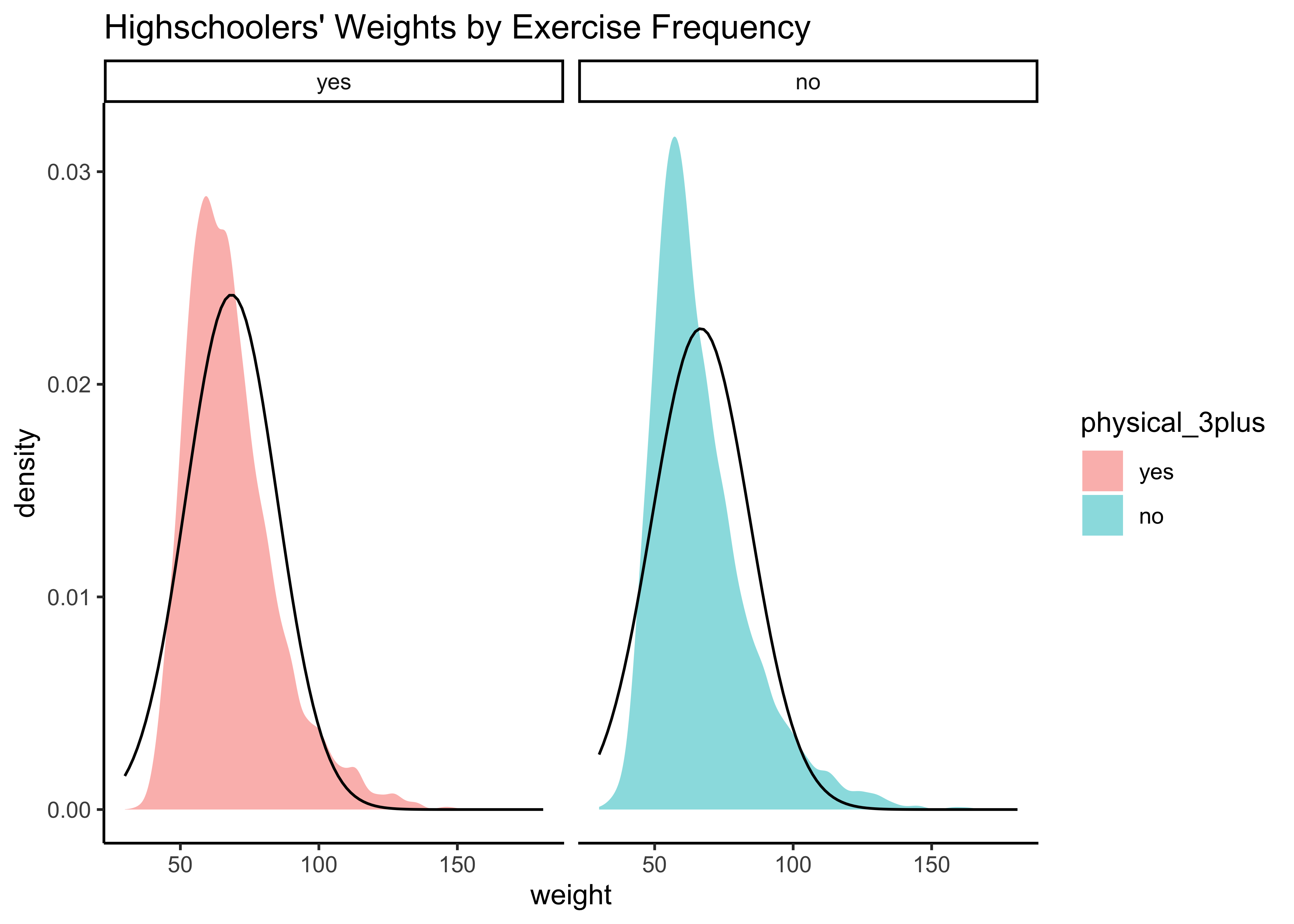 title = "Highschoolers' Weights by Exercise Frequency"