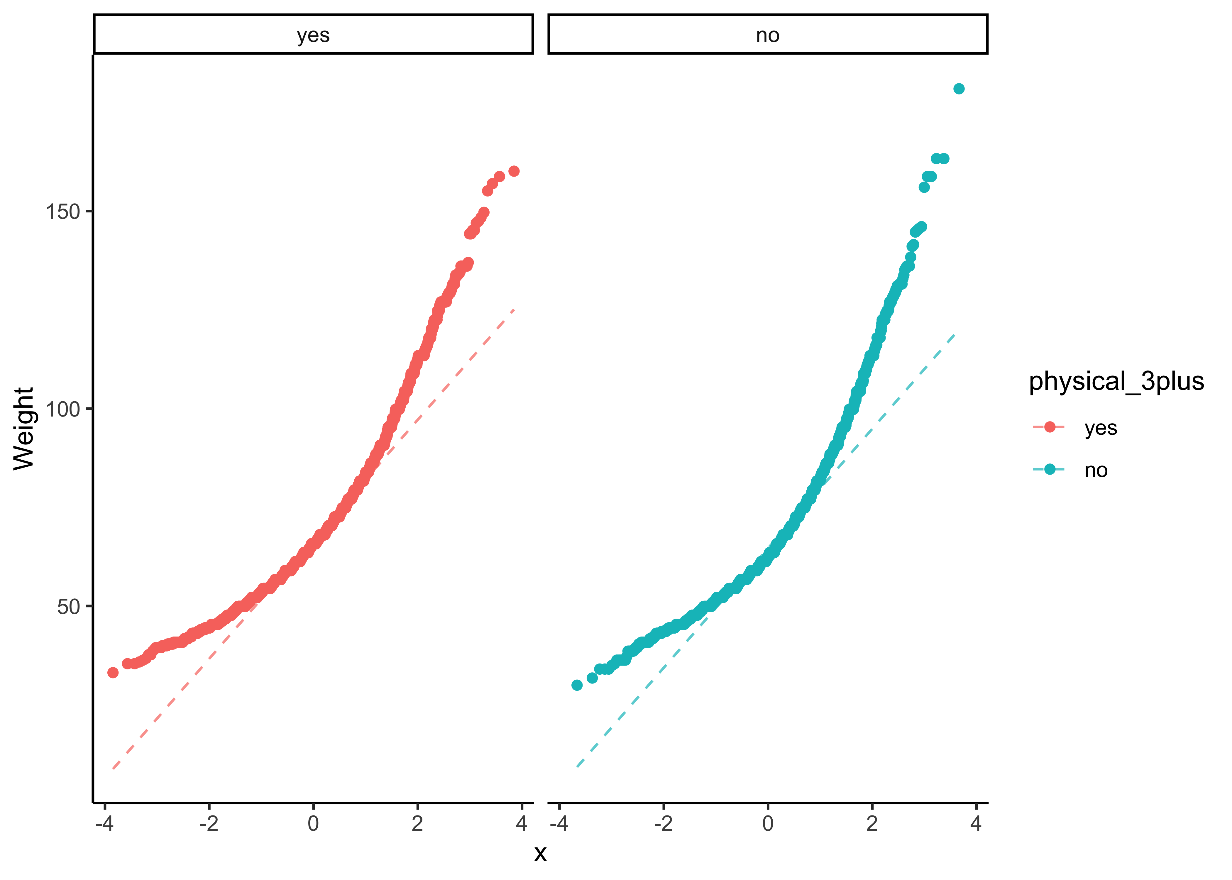gf_qq(~ weight | physical_3plus, color = ~physical_3plus) %>%