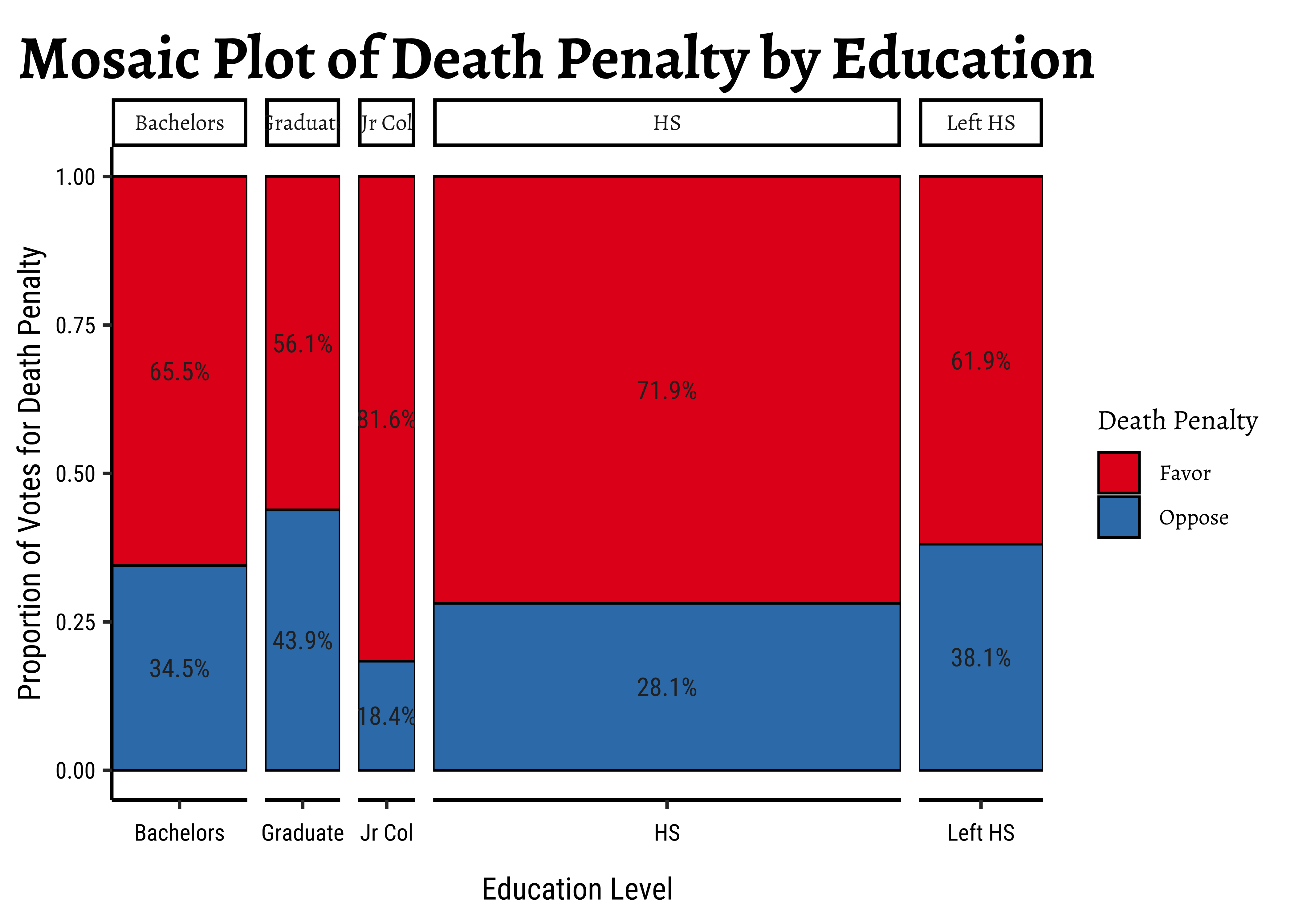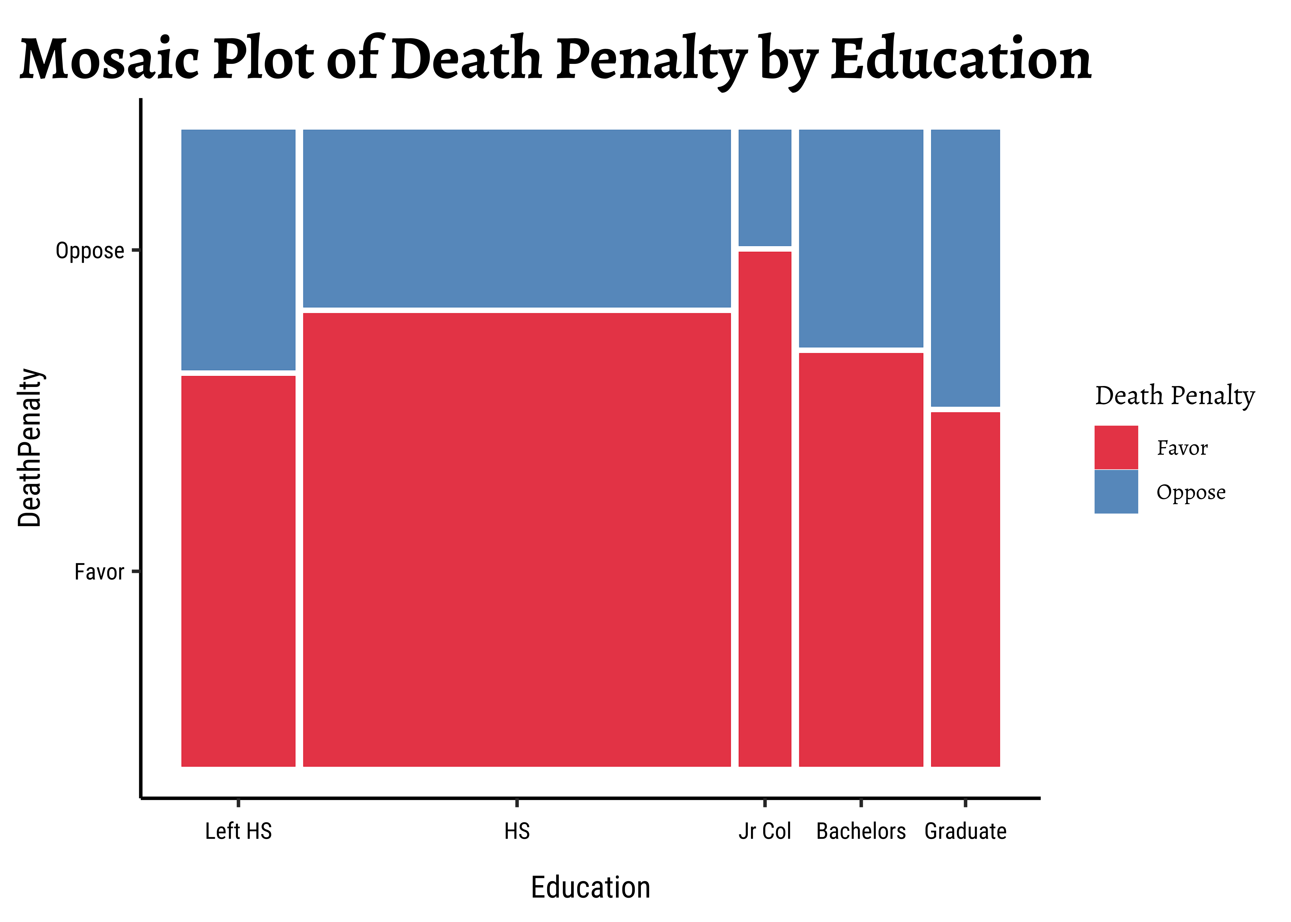 Let us try a dataset with Qualitative / Categorical data. This is the General Social Survey GSS dataset from the resampledata package, and we have people with different levels of Education stating their opinion on the Death Penalty. We want to know if these two Categorical variables have a correlation, i.e. can the opinions in favour of the Death Penalty be explained by the Education level?