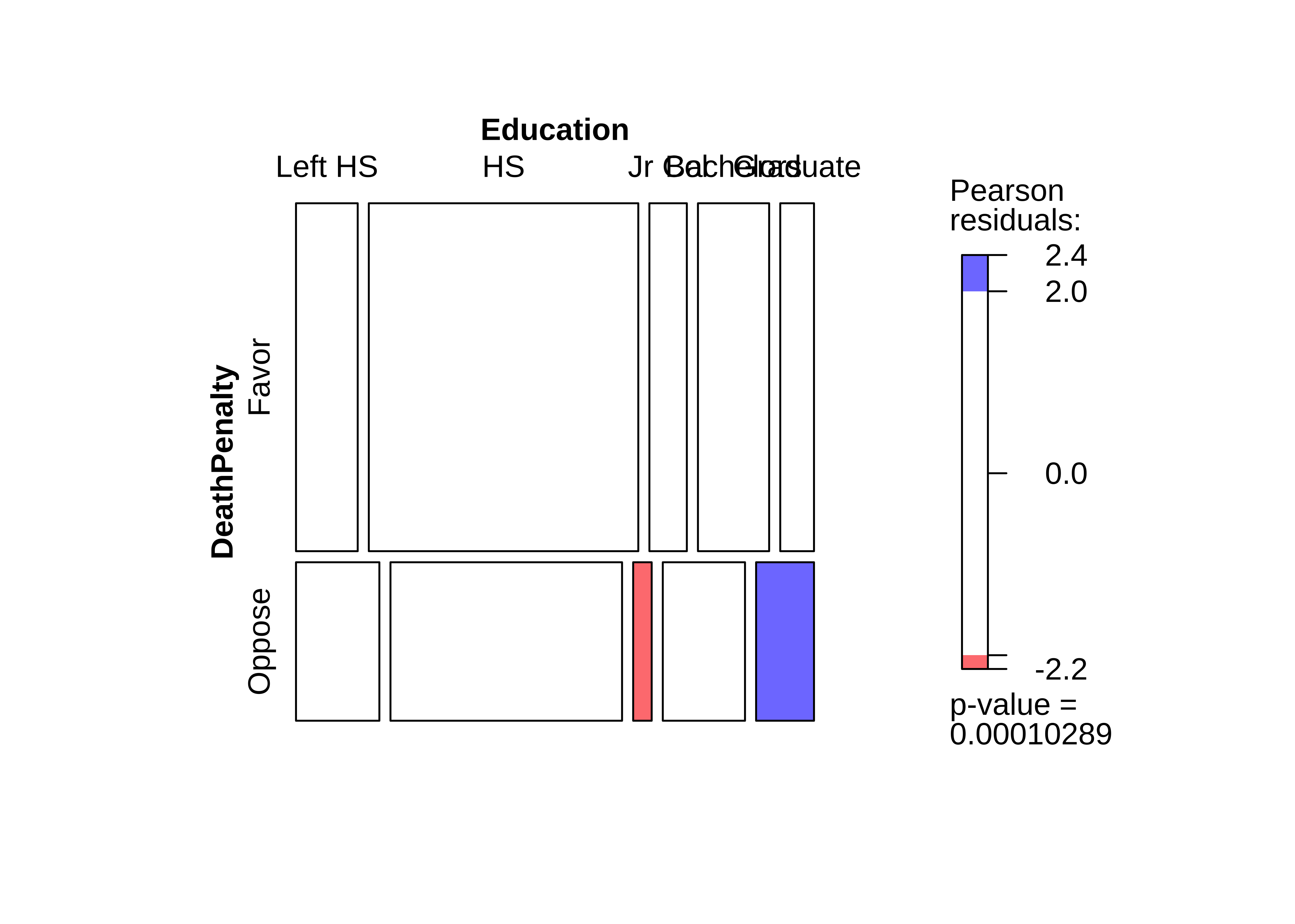 The p-value is well below our threshold of Education has a significant effect on DeathPenalty opinion!