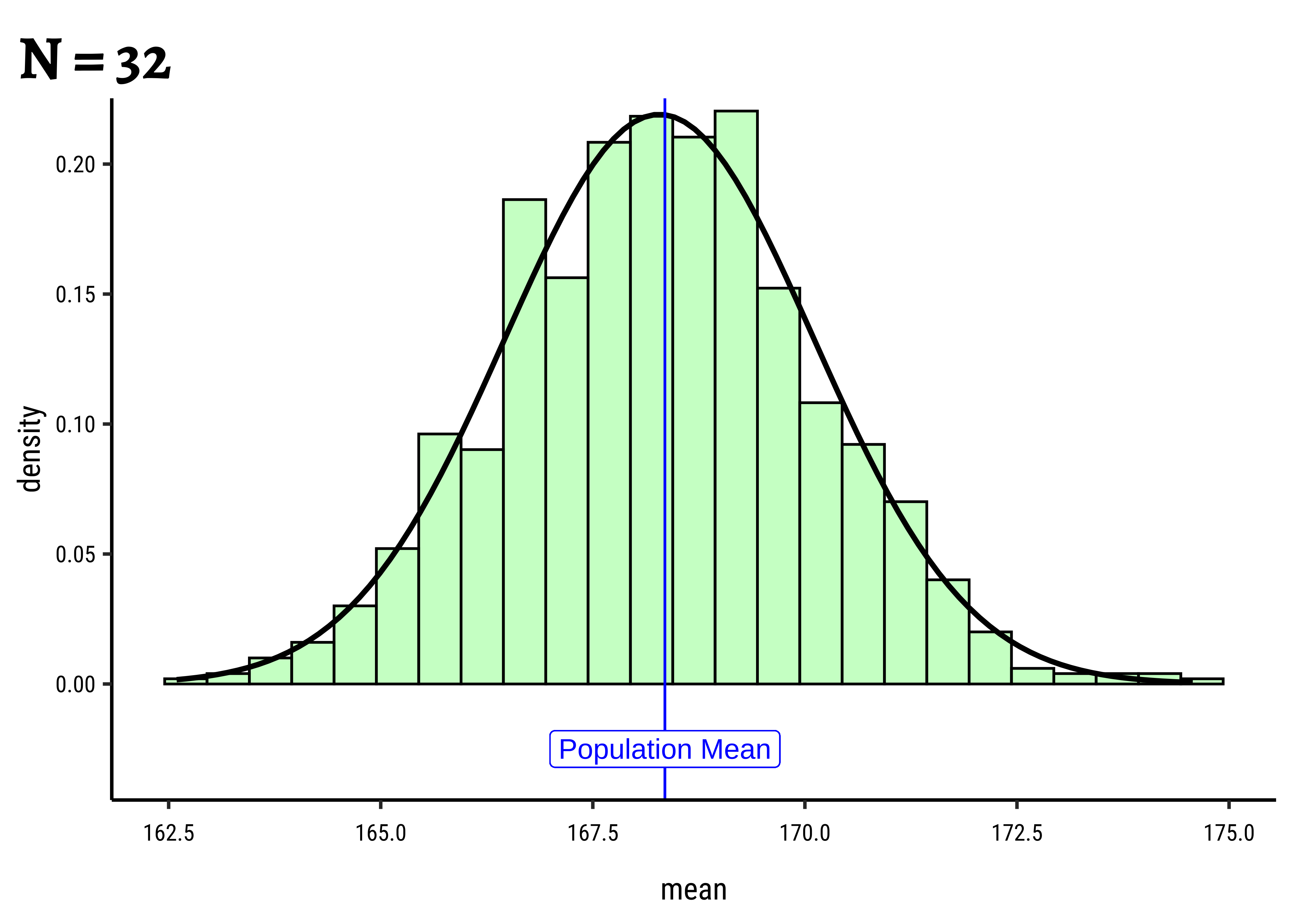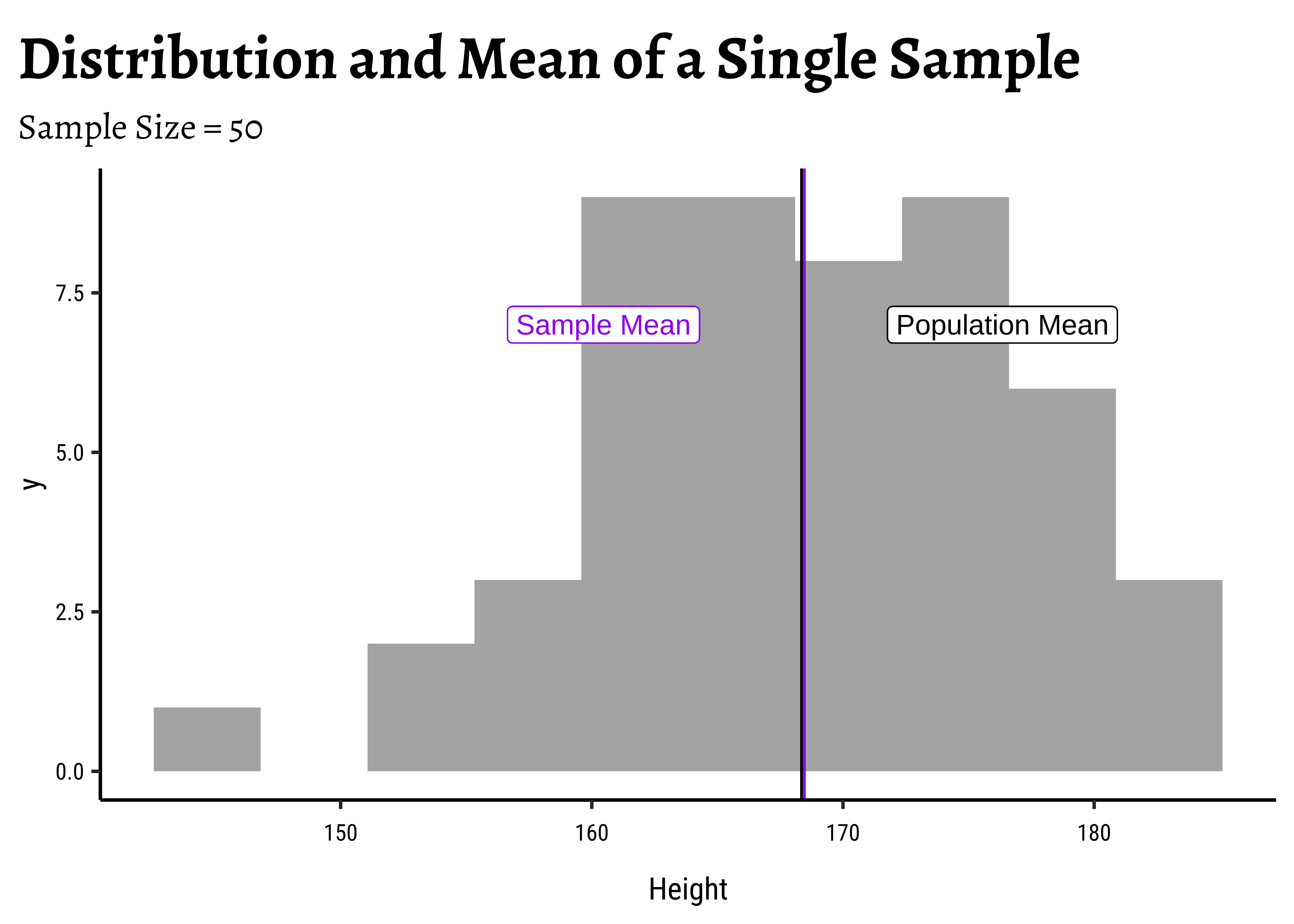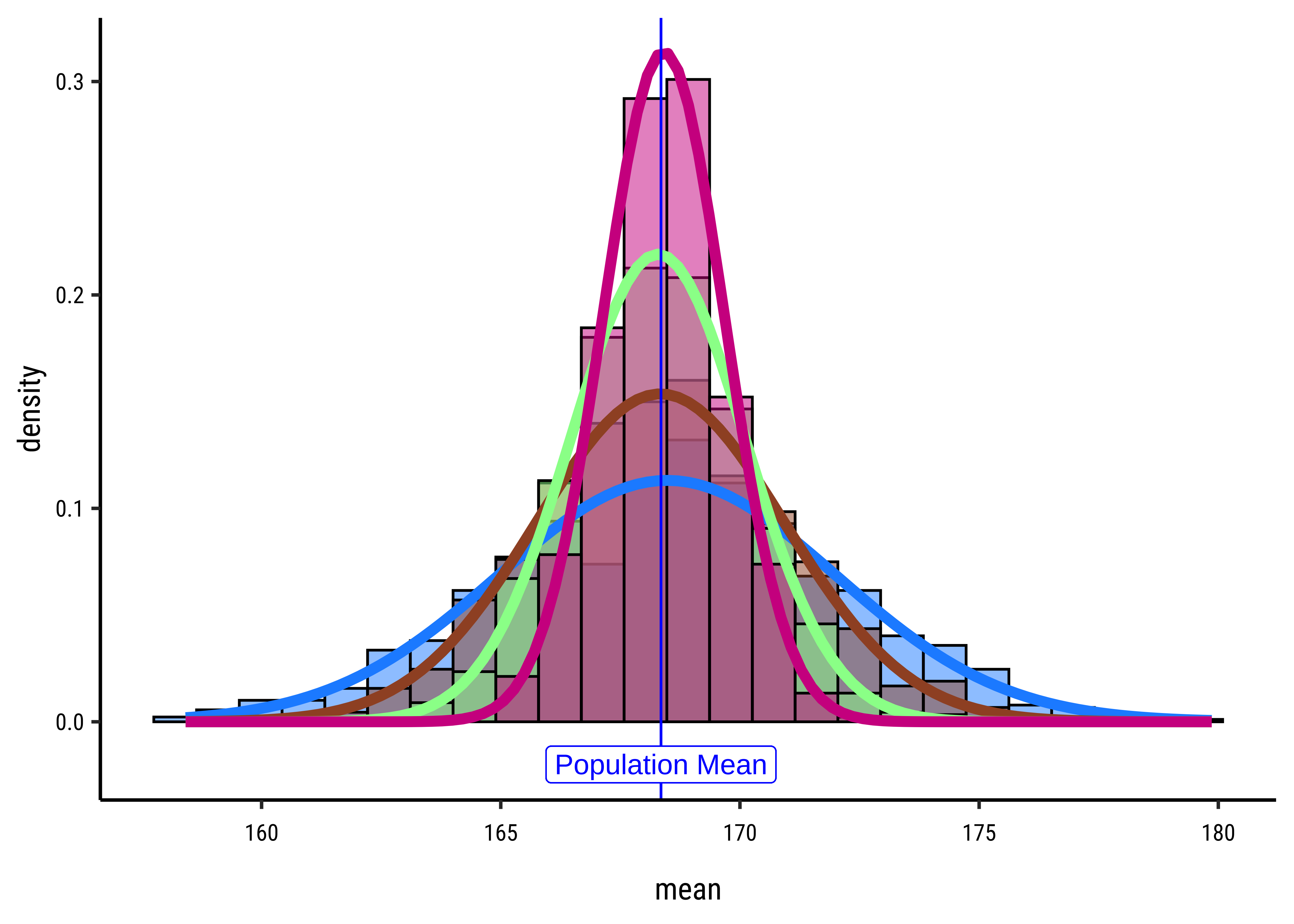 gf_refine(annotate(geom = "label", x = pop_mean + 1.75, y = 1.5, label = "Population Mean"))Yes, with sample size! Why is that a good thing?