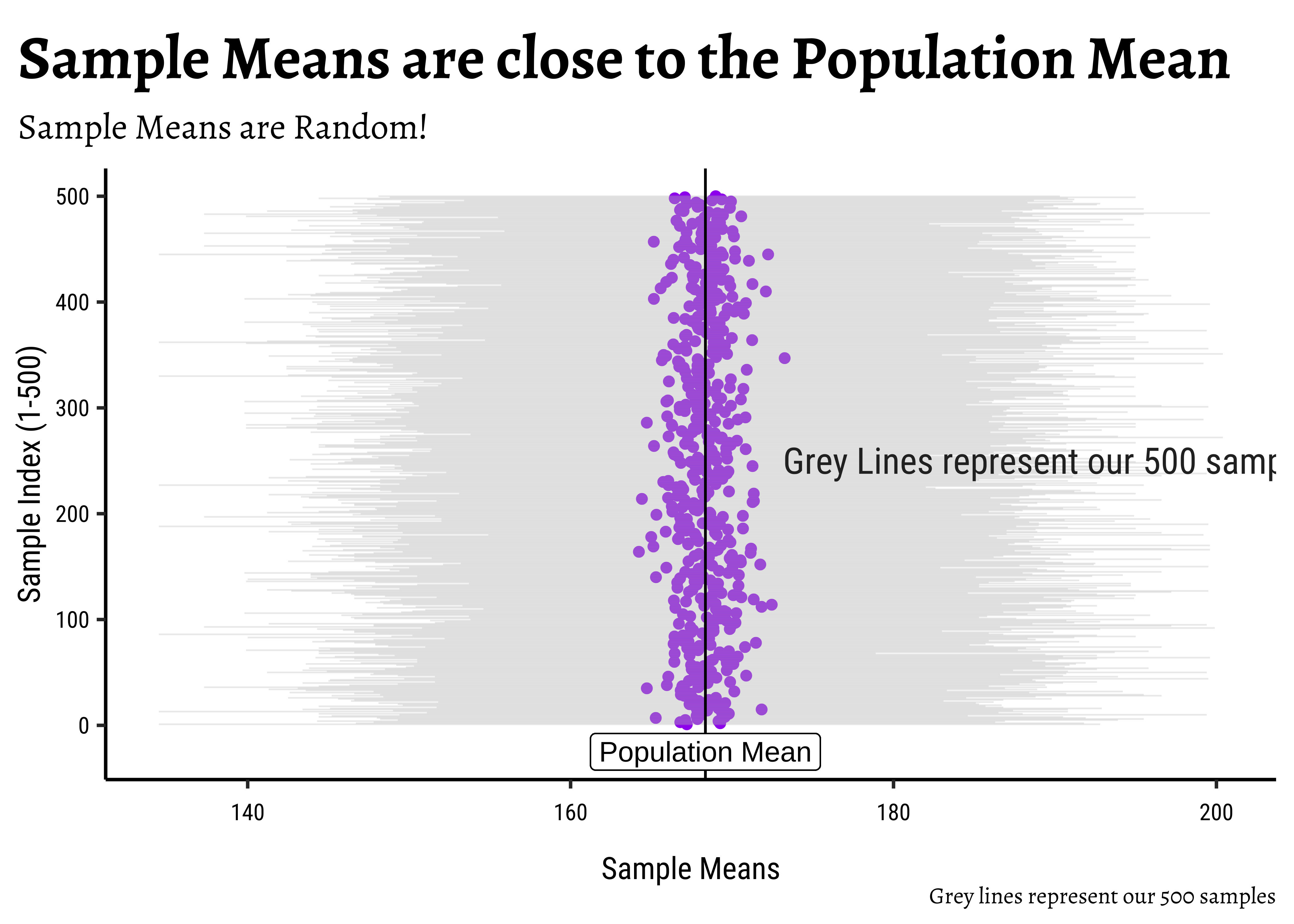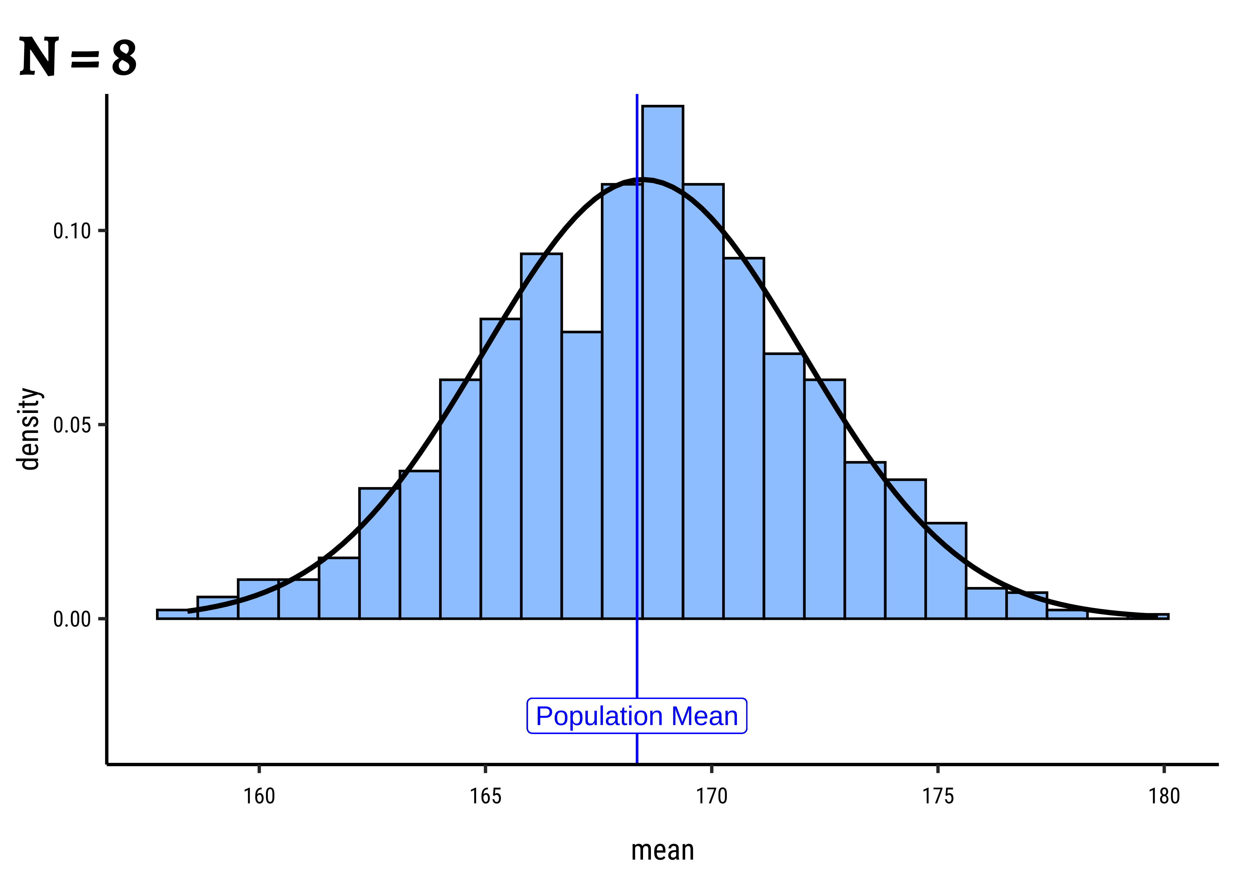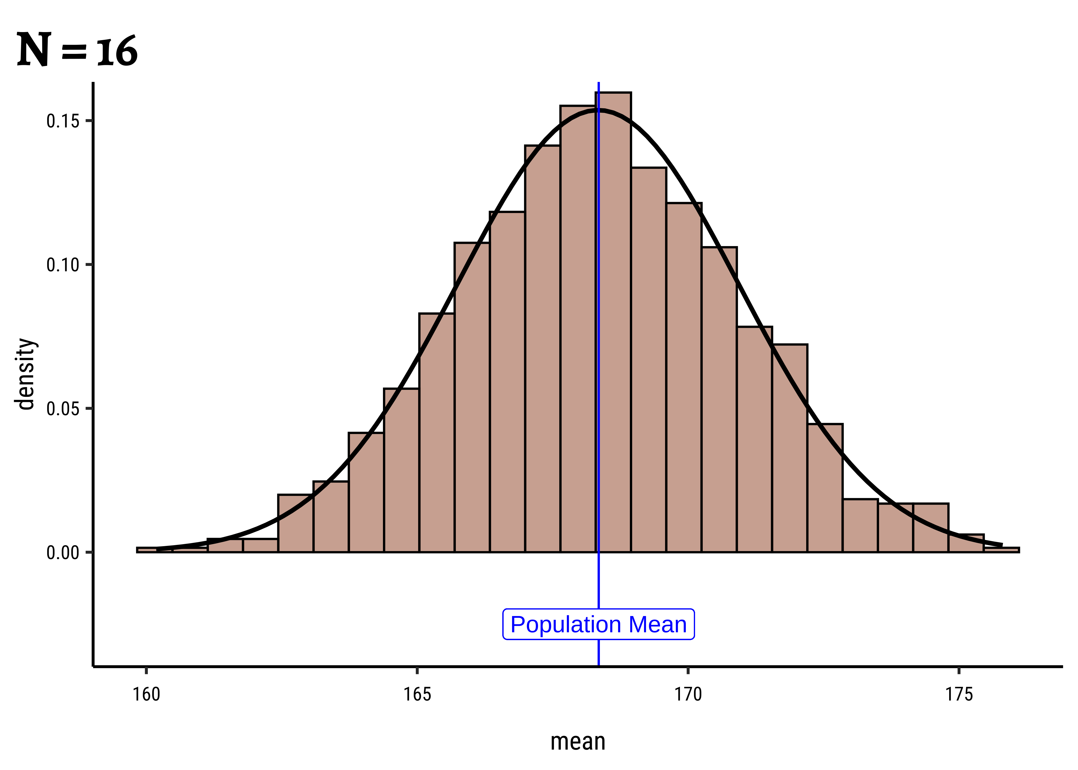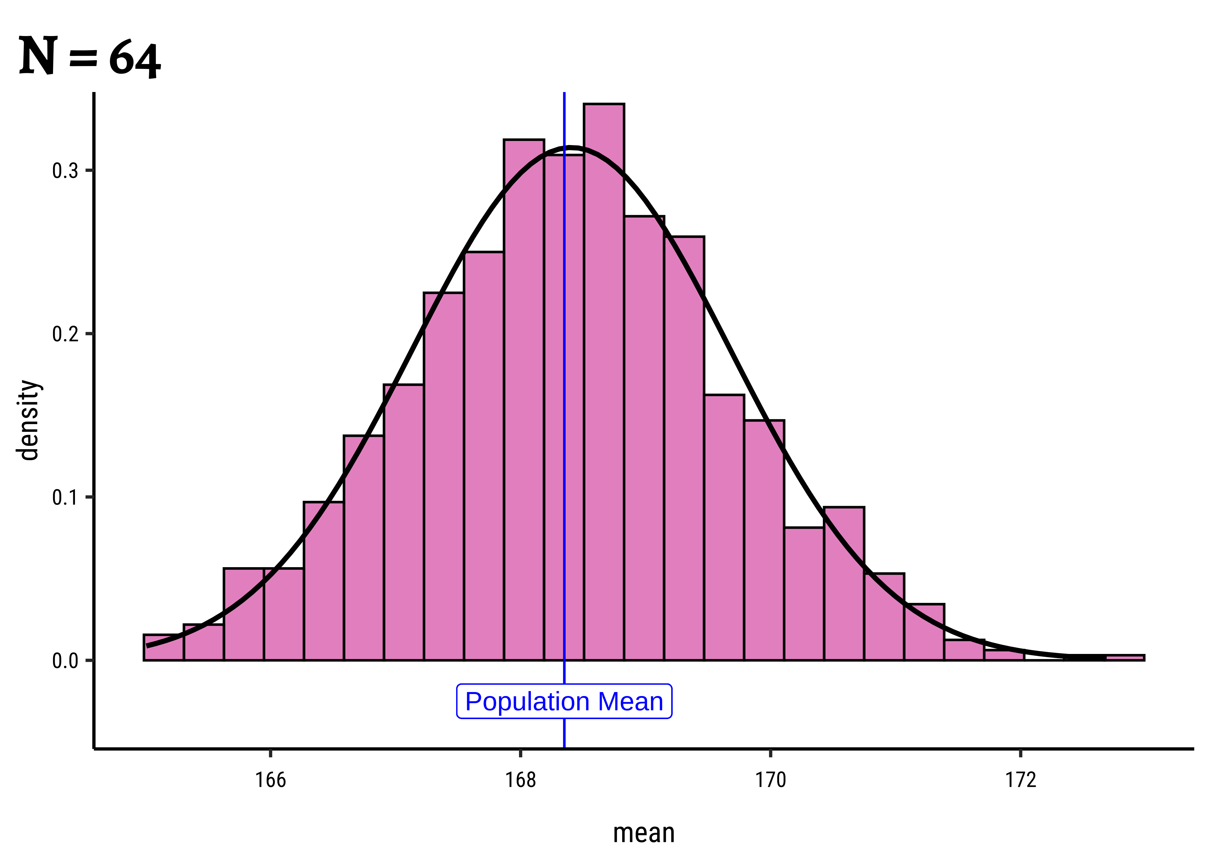 gf_refine(annotate(geom = "label", x = pop_mean + 1.75, y = 1.5, label = "Population Mean"))Yes, with sample size! Why is that a good thing?