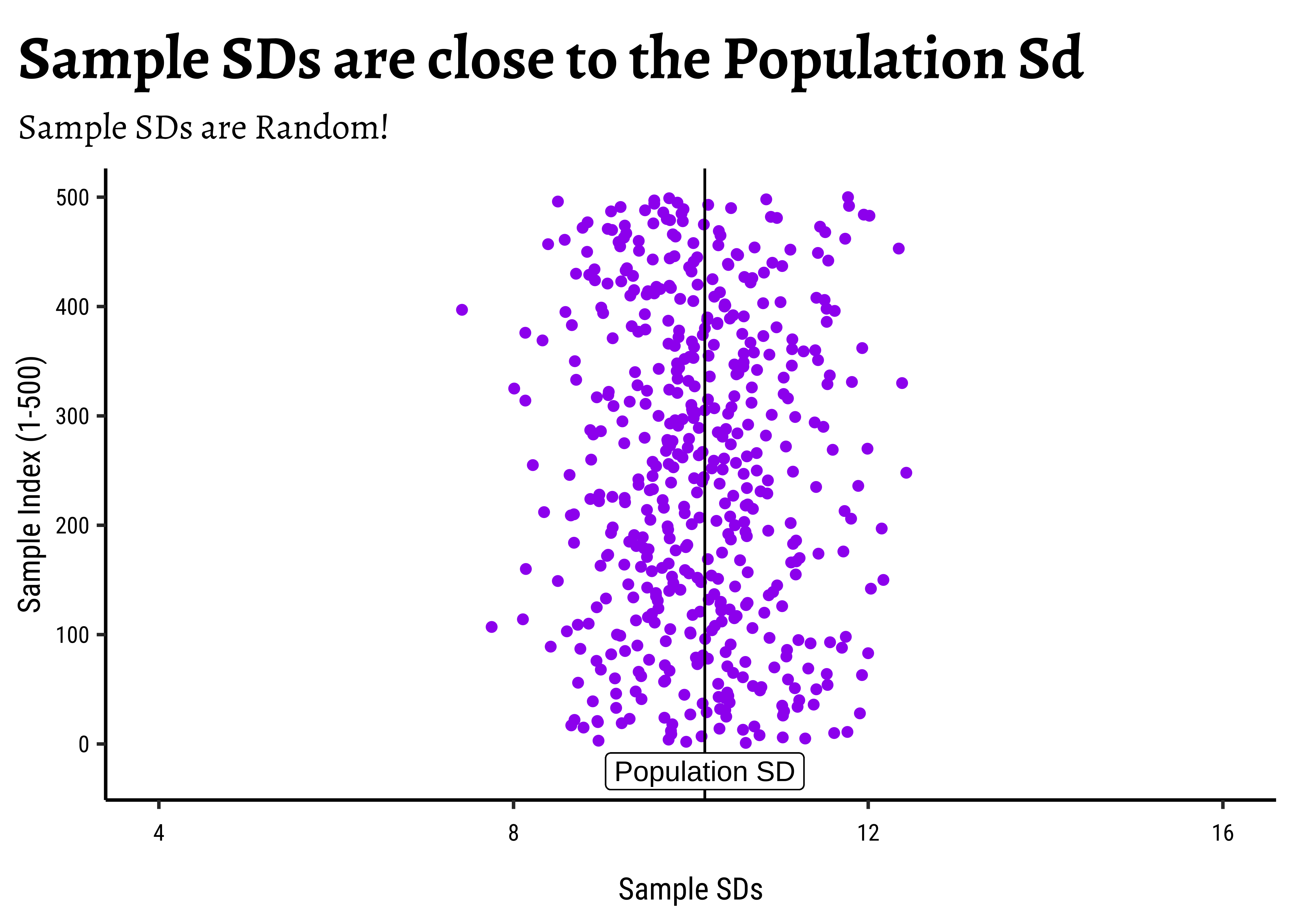 As we saw at the start of this module, the sample-means are distributed around the pop_mean, AND it appears that the sample-sds are also distributed around the pop_sd!