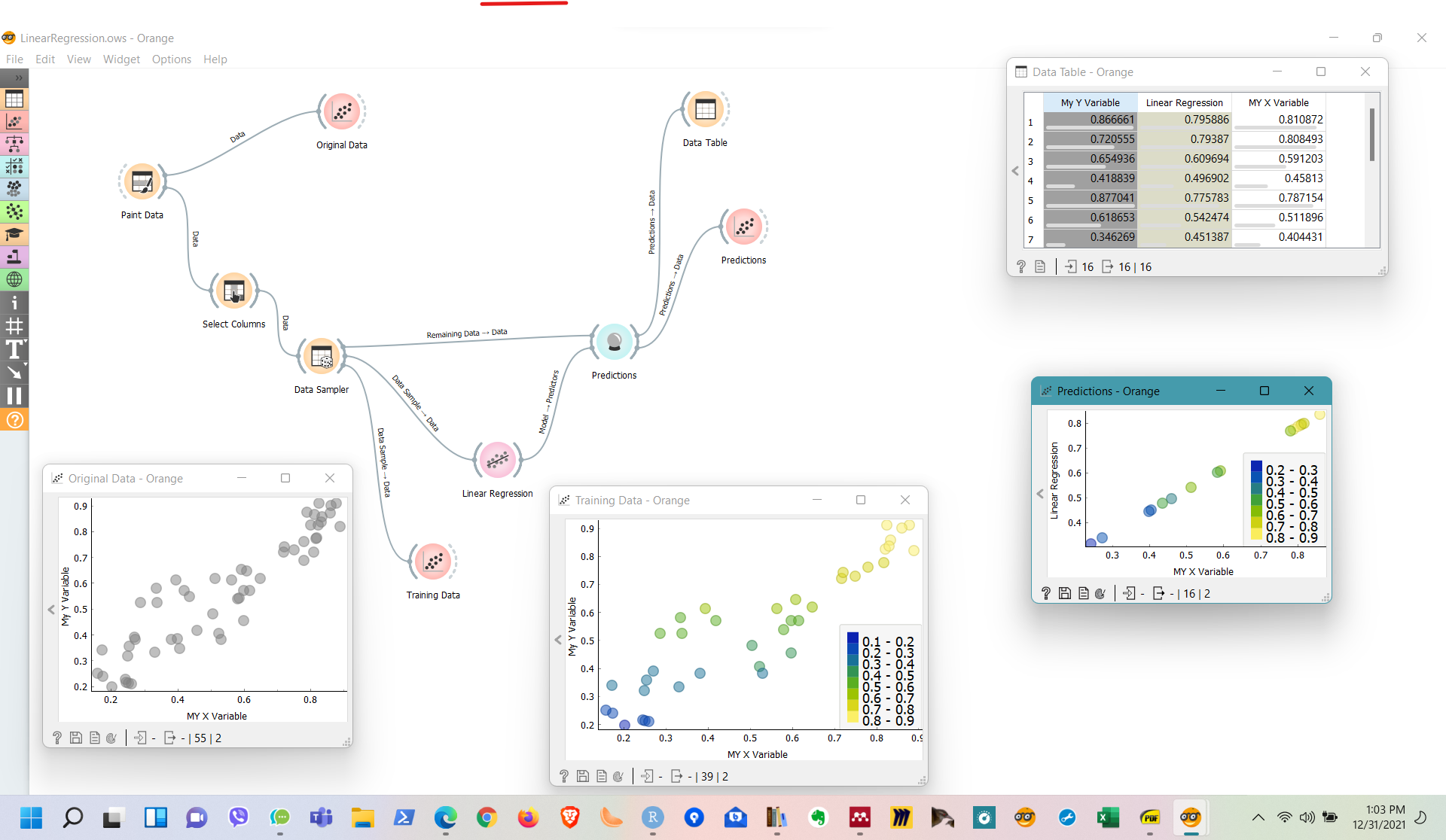 Let us “draw inspiration” from the picture above, and see if we can replicate it. We will fire up Orange, paint some data and see if we can fit a linear regression ML model to it.