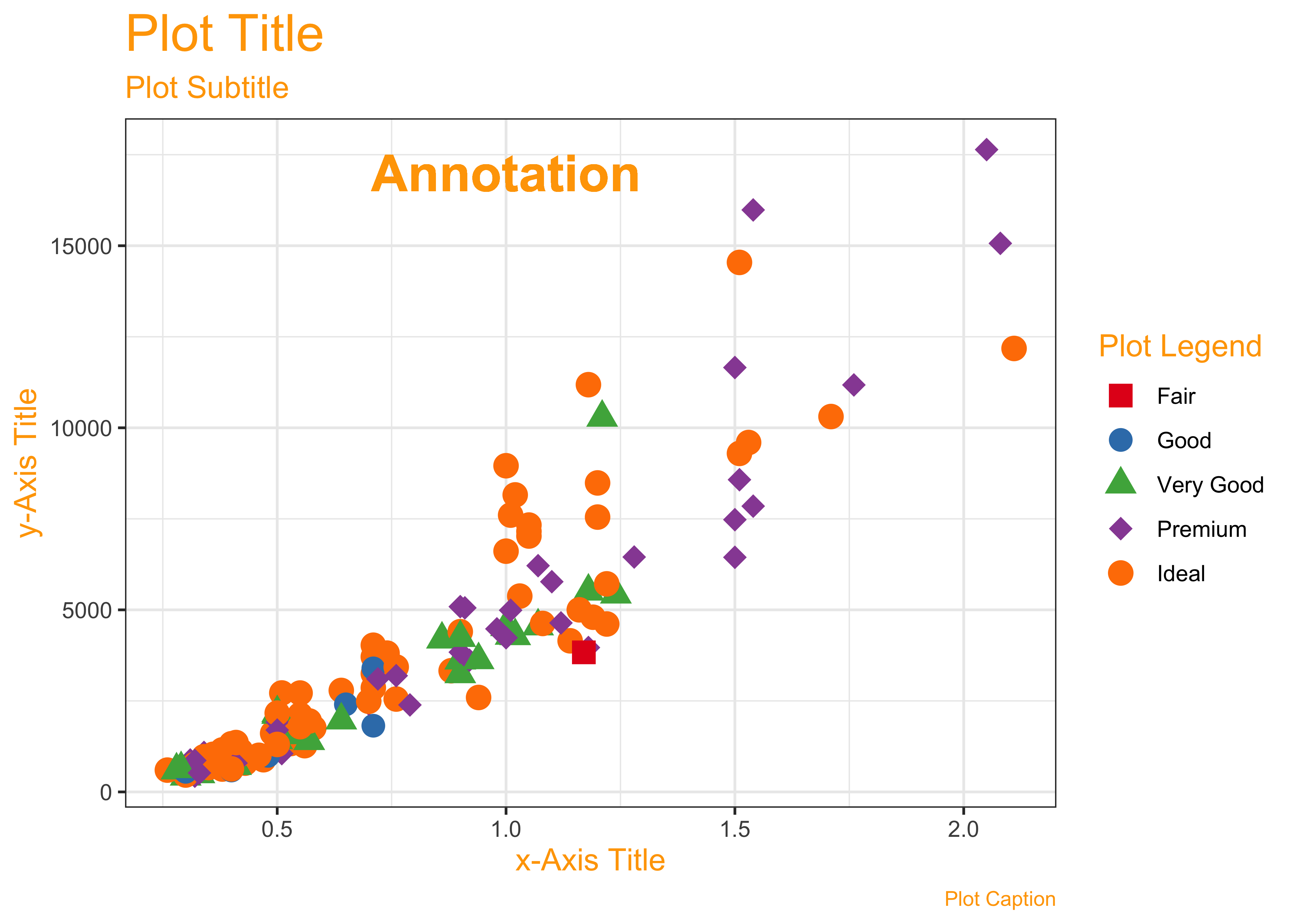 In the above chart, it is pretty clear what kind of variable is plotted on the x-axis and the y-axis. What about colour? Could this be considered a z-axis in the chart? There are also other aspects that you can choose (not explicitly shown here) such as the plot theme(colours, fonts, backgrounds etc), which may not be mapped to data, but are nonetheless choices to be made. We will get acquainted with this aspect as we build charts.