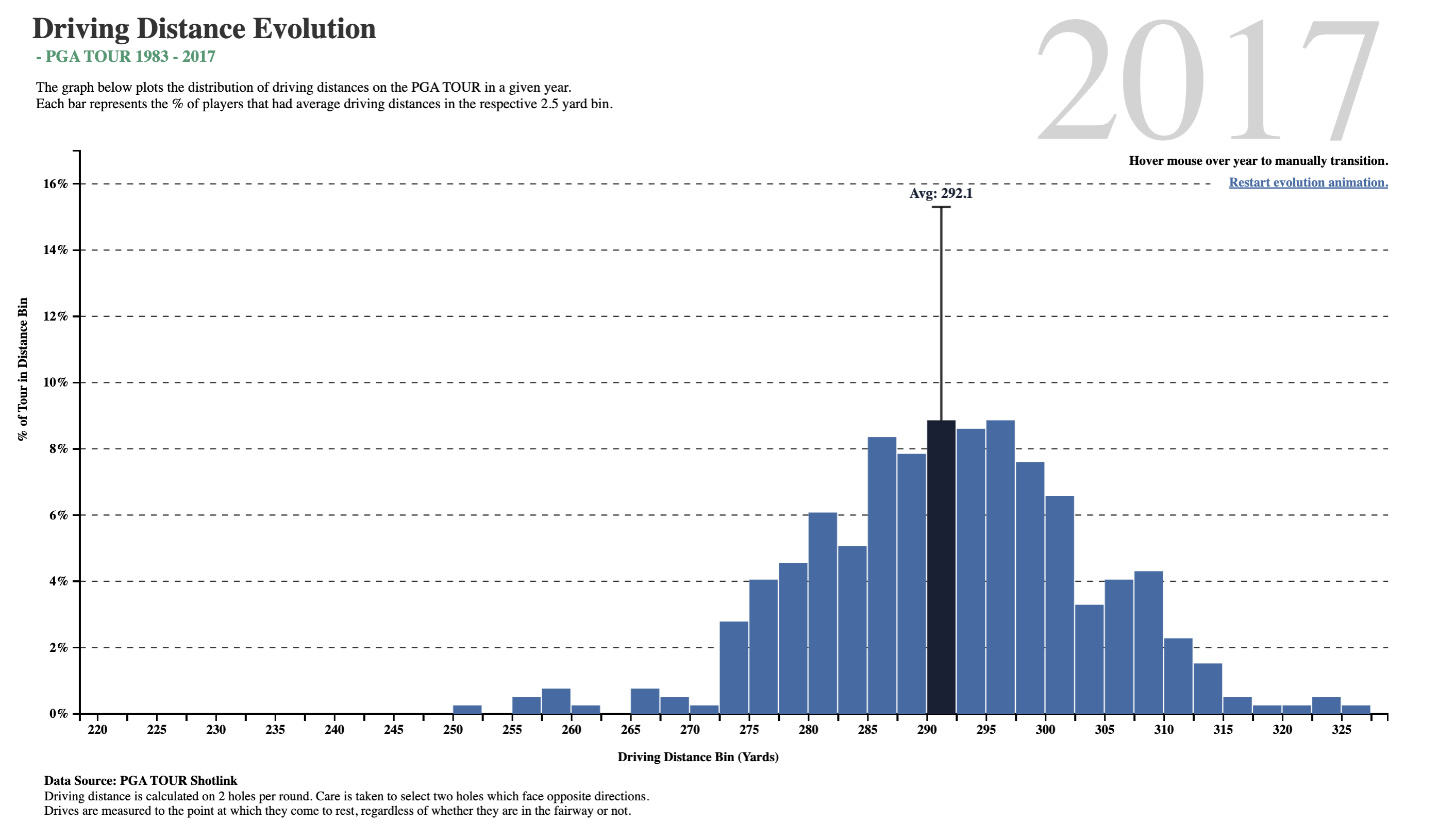 What do we see here? In about two-and-a-half decades, golf drive distances have increased, on the average, by 35 yards. The maximum distance has also gone up by 30 yards, and the minimum is now at 250 yards, which was close to average in 1983! What was a decent average in 1983 is just the bare minimum in 2017!!