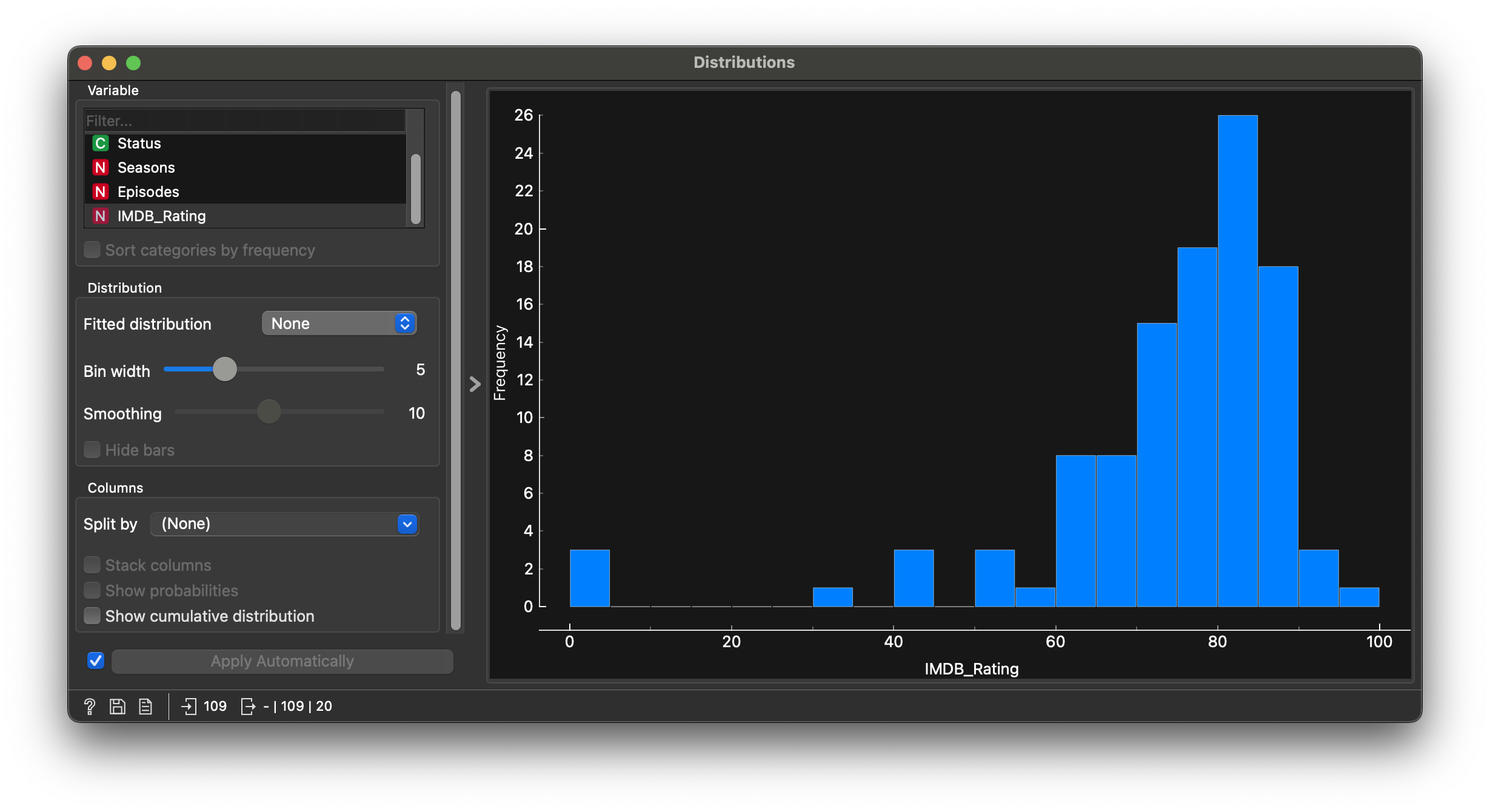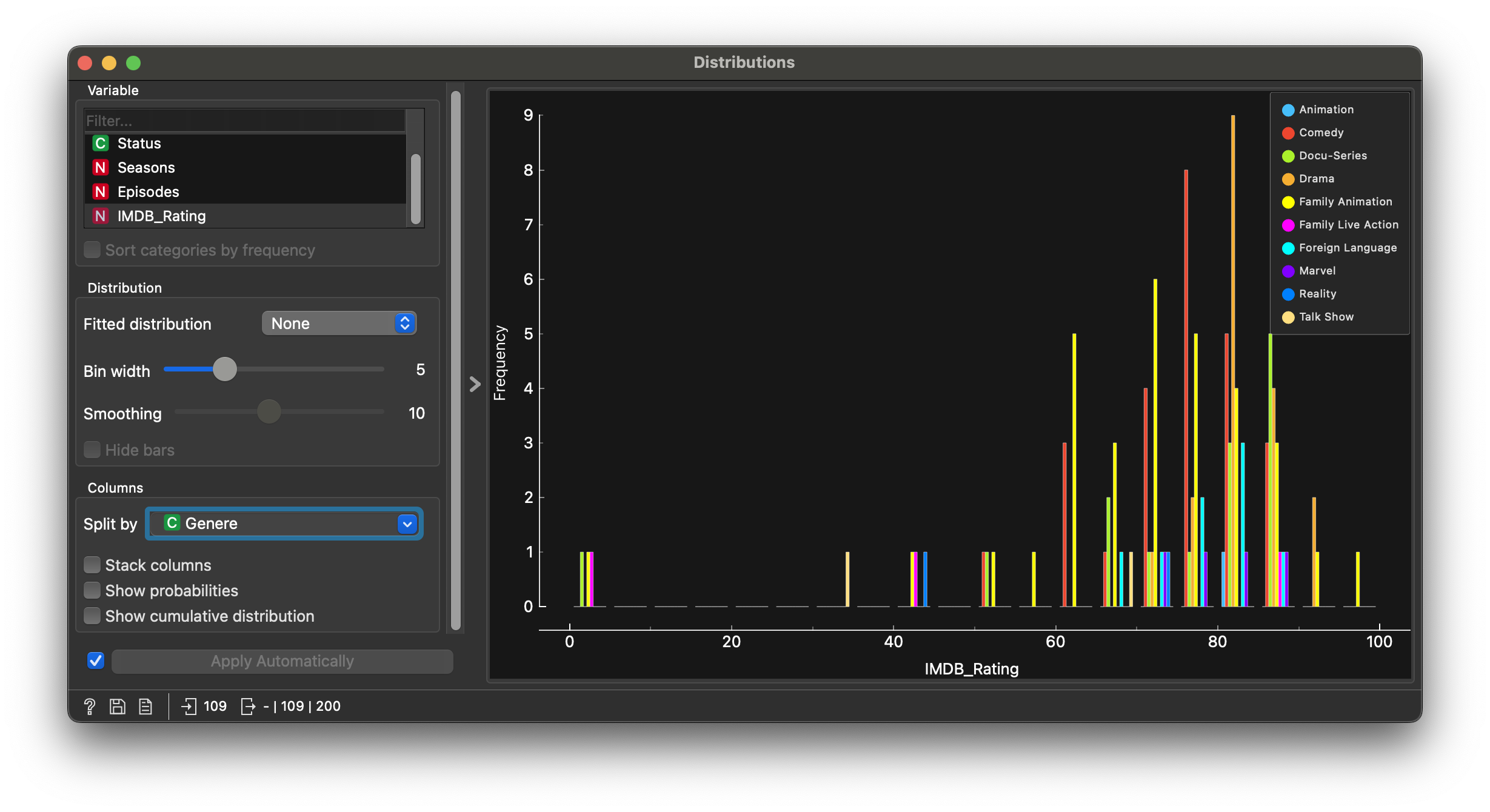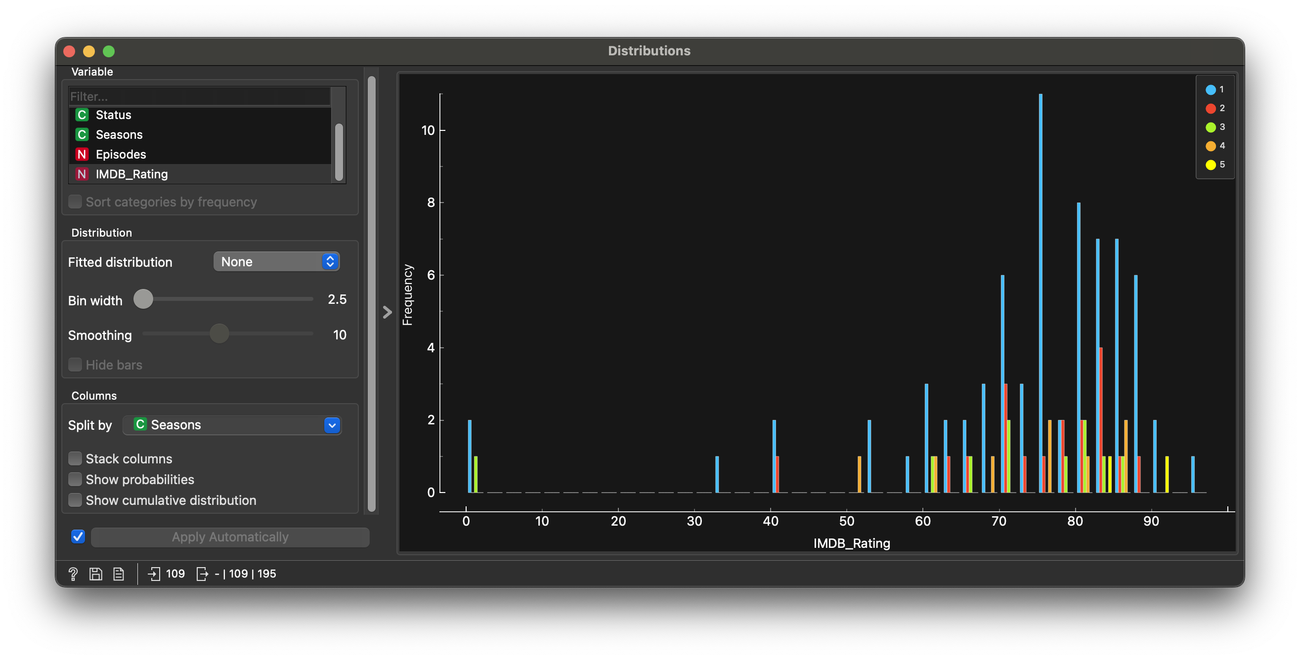 We first need to reformat the Seasons variable from N to C in the data file view. This converts it to Qual. Then we split the IMDB histogram by this new variable.