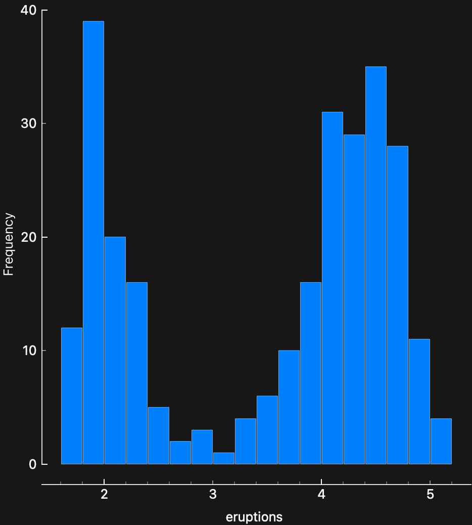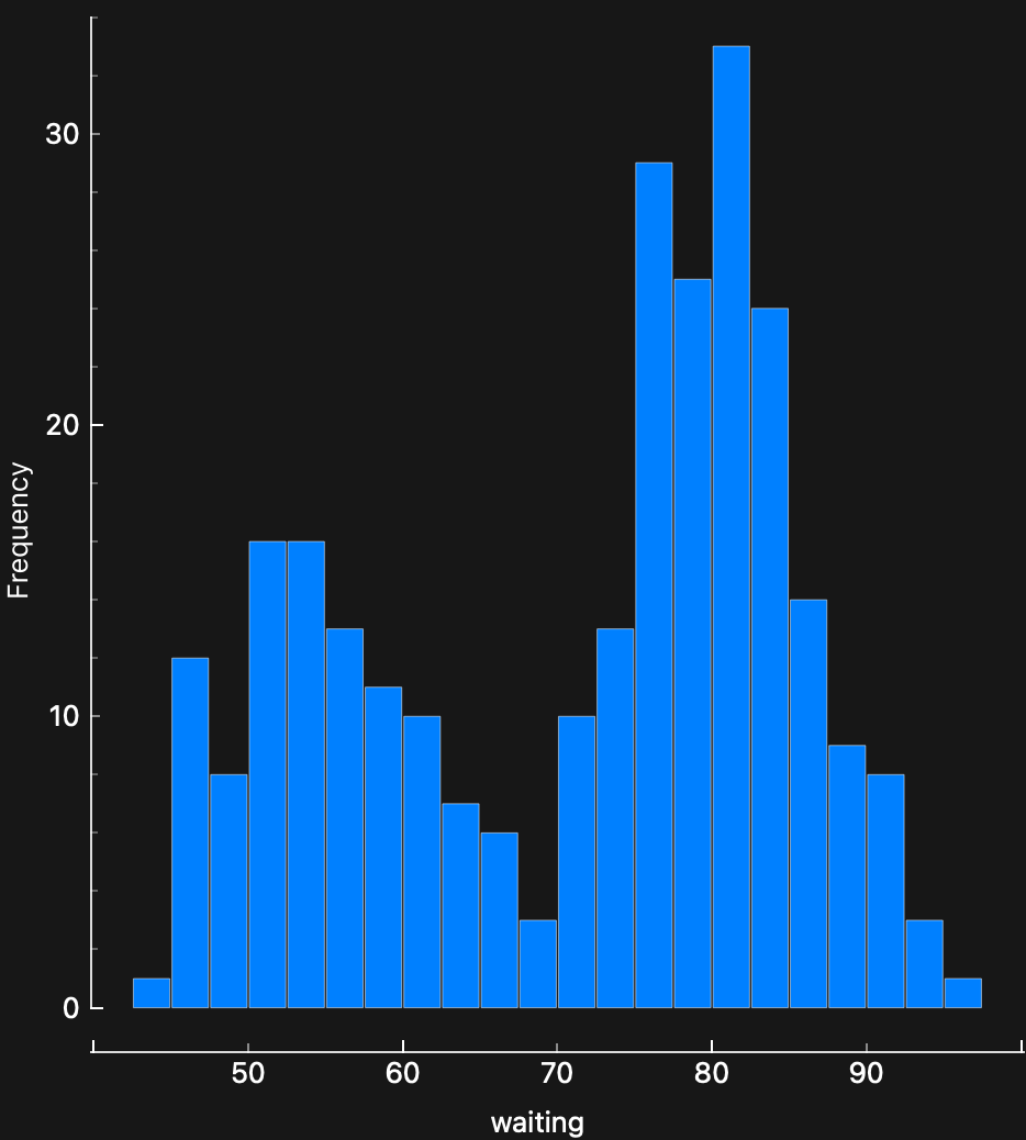 Bimodal: Maybe two different systems or phenomena or regimes under which the data unfolds. Like our geyser above. Or a machine that works differently when cold and when hot. Intermittent faulty behaviour…