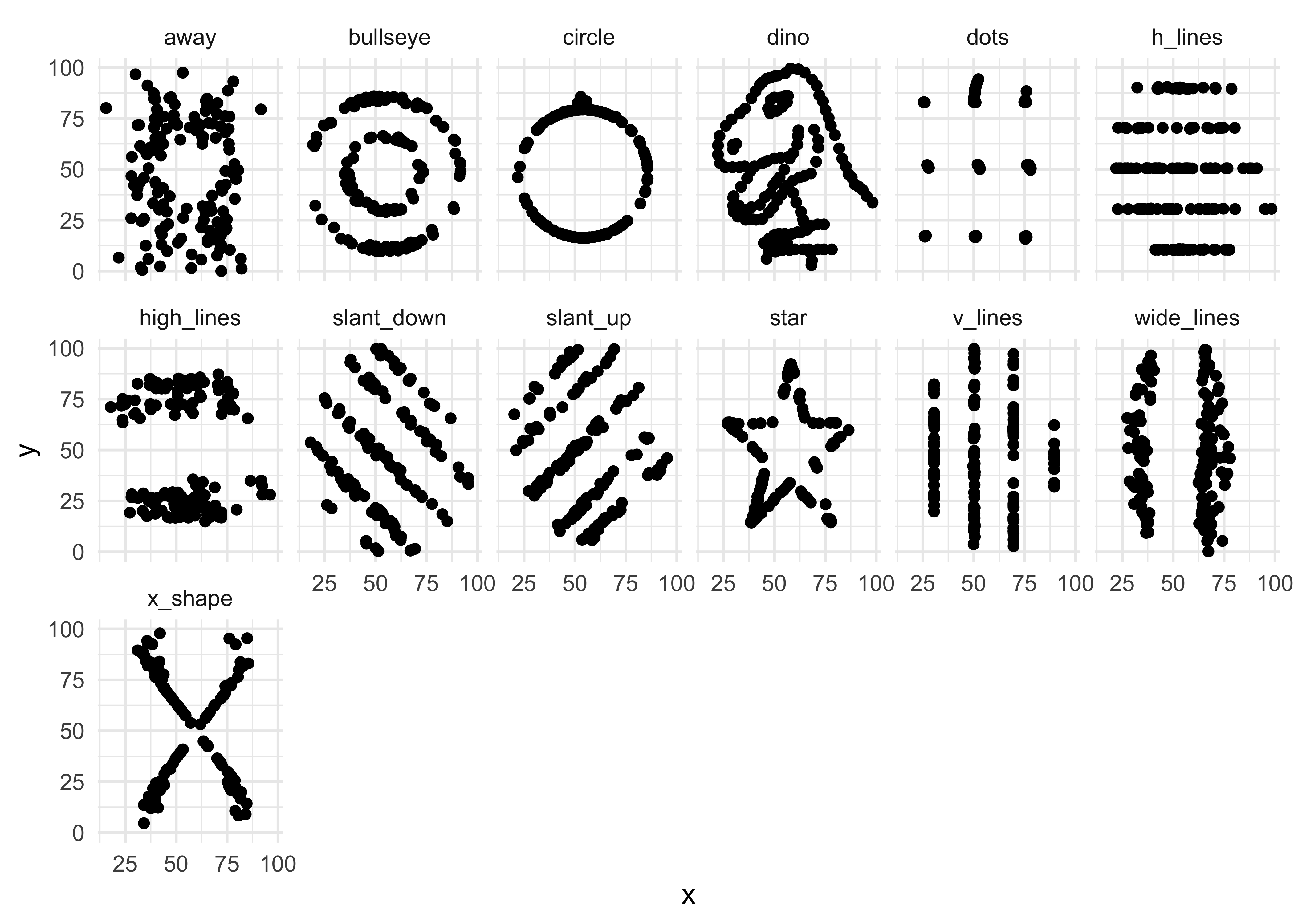 The Datasaurus Package: https://cran.r-project.org/web/packages/datasauRus/vignettes/Datasaurus.html