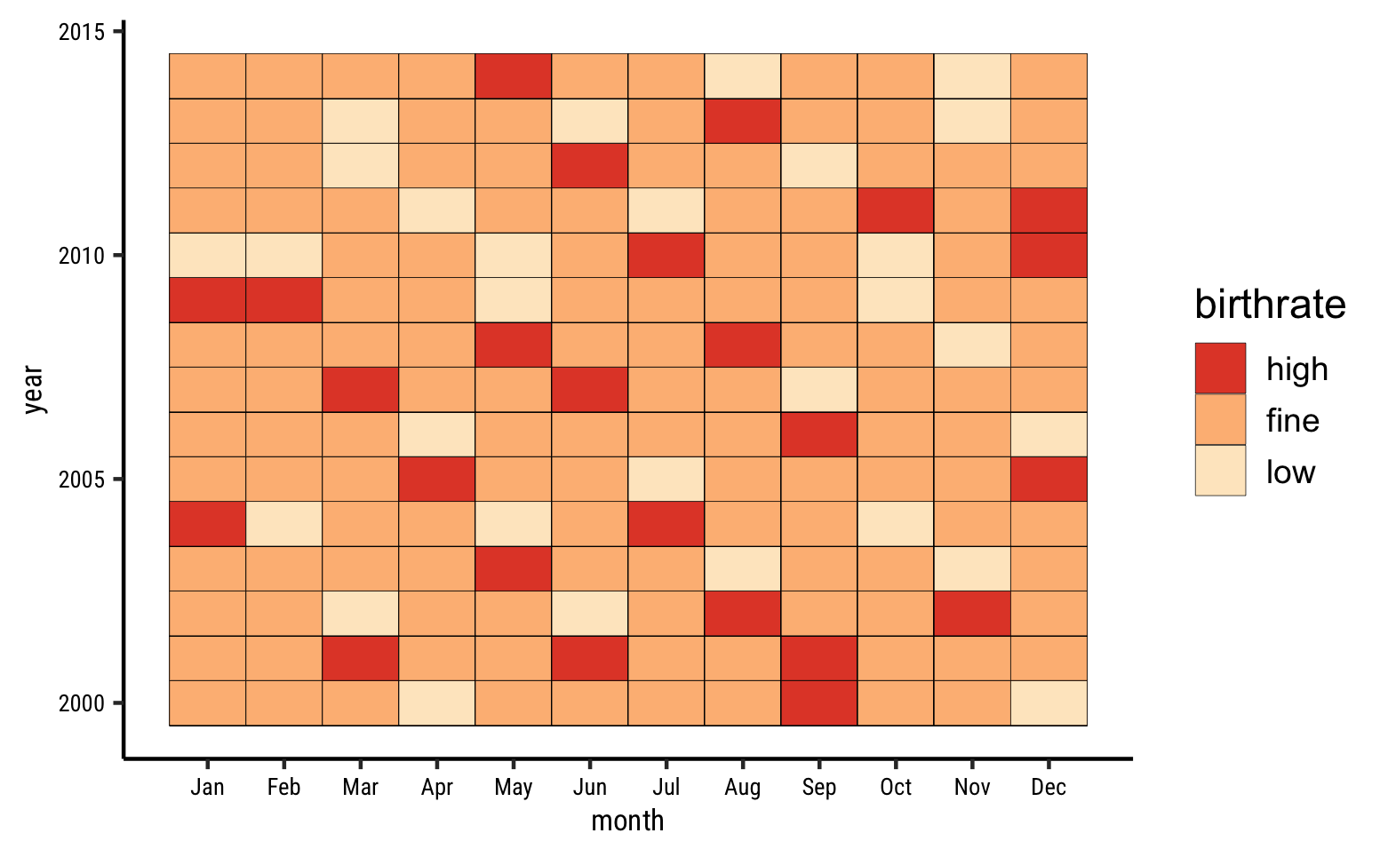 Very arbitrarily slicing the birth numbers into three bins titled high, fine, and low, we can plot a heatmap like this. Orange does have a heatmap widget, however it seems suited to Machine Learning methods such as Clustering. We need to investigate its possibilities for time series.