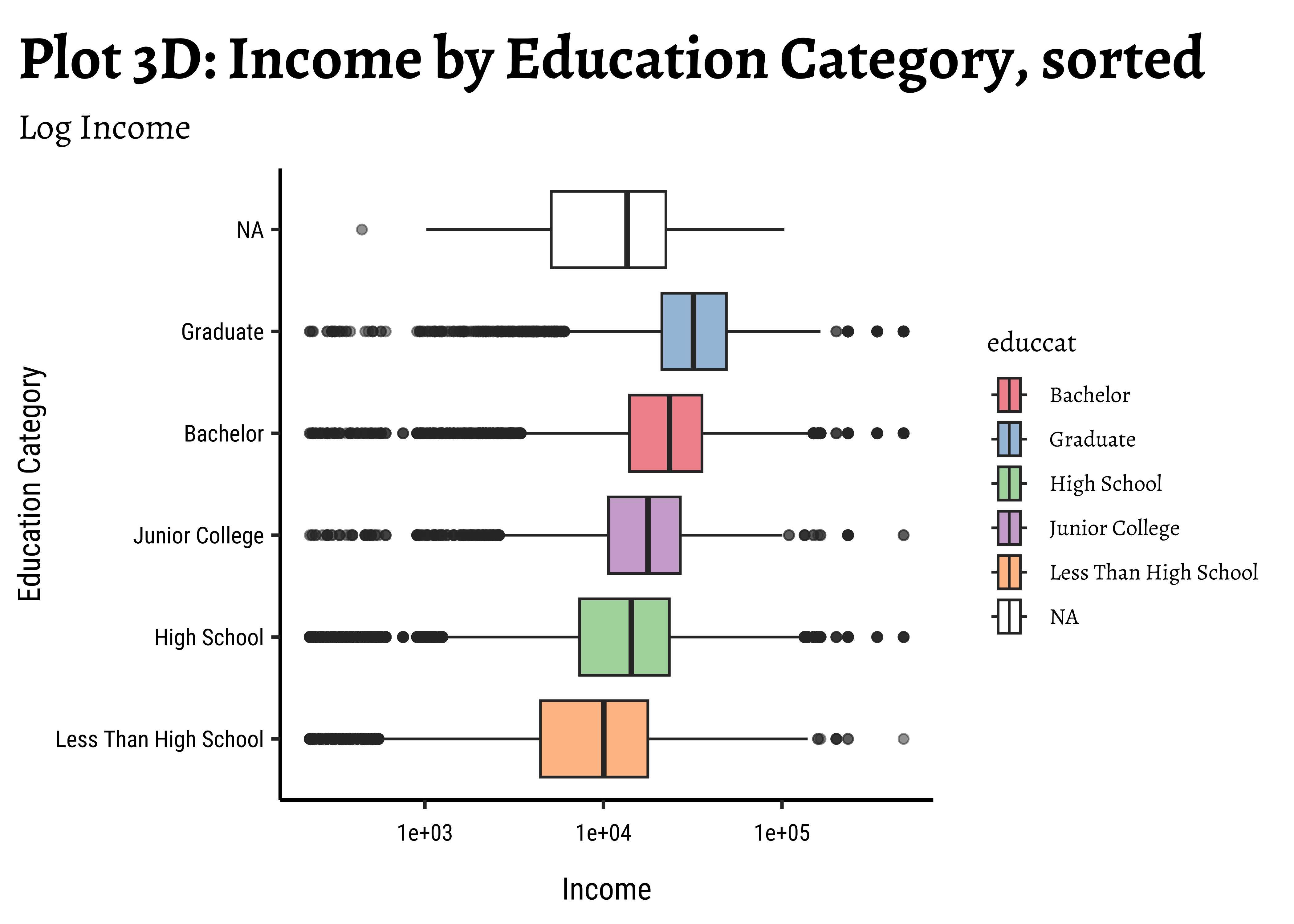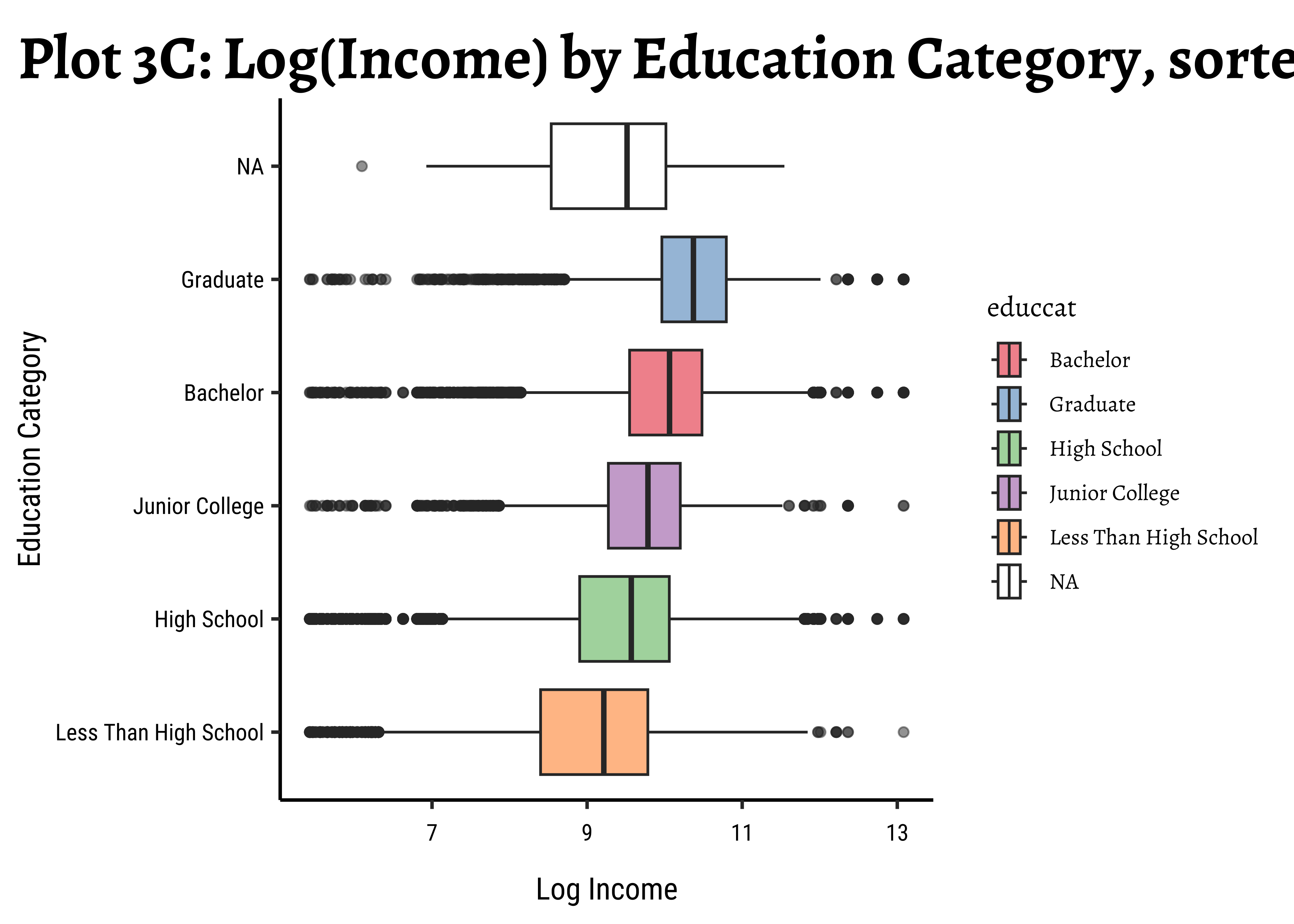 title = "Plot 3C: Log(Income) by Education Category, sorted",