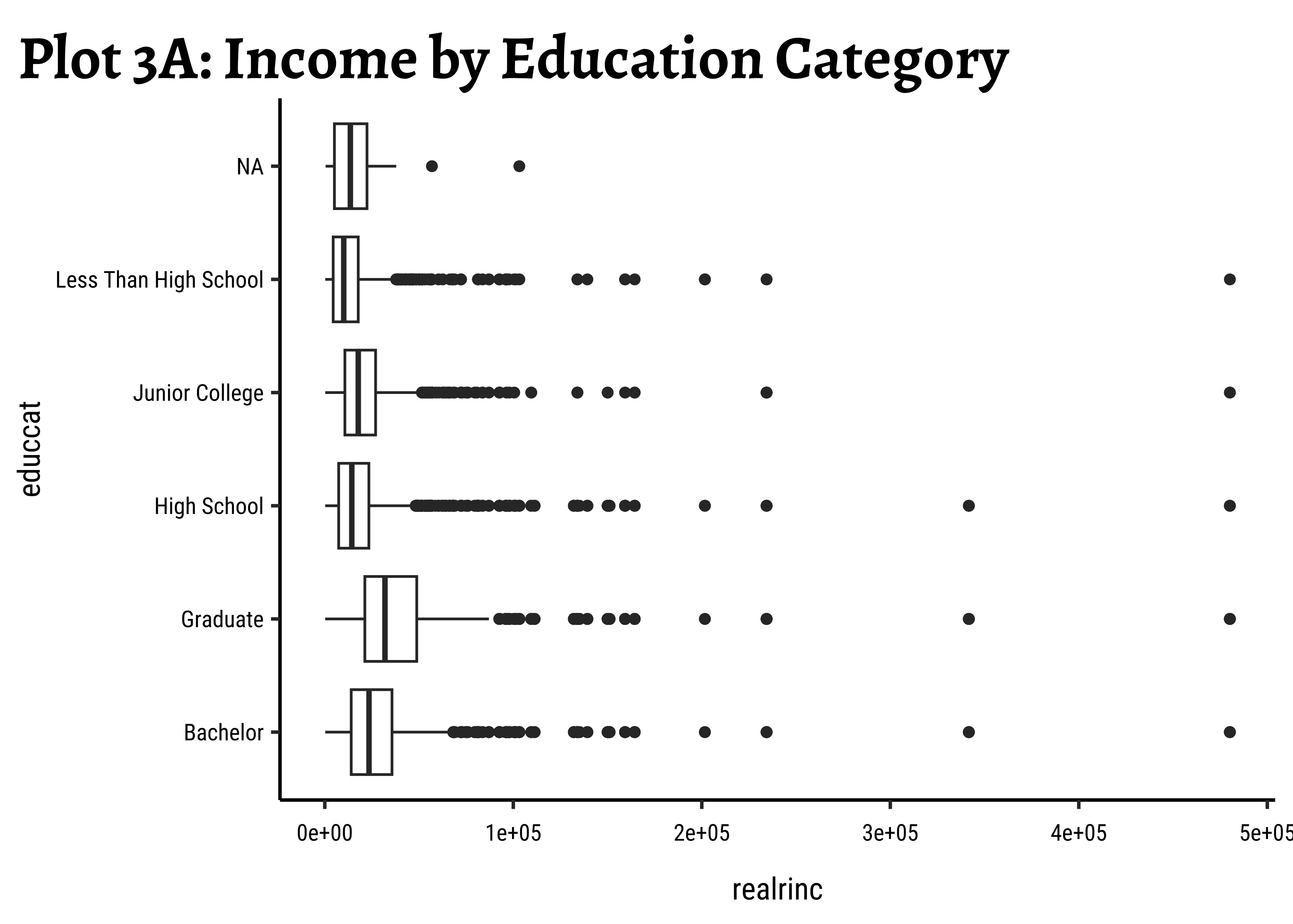 gf_labs(title = "Plot 3A: Income by Education Category")# ggplot2::theme_set(new = theme_classic(base_family = "Roboto Condensed")) # Set consistent graph theme