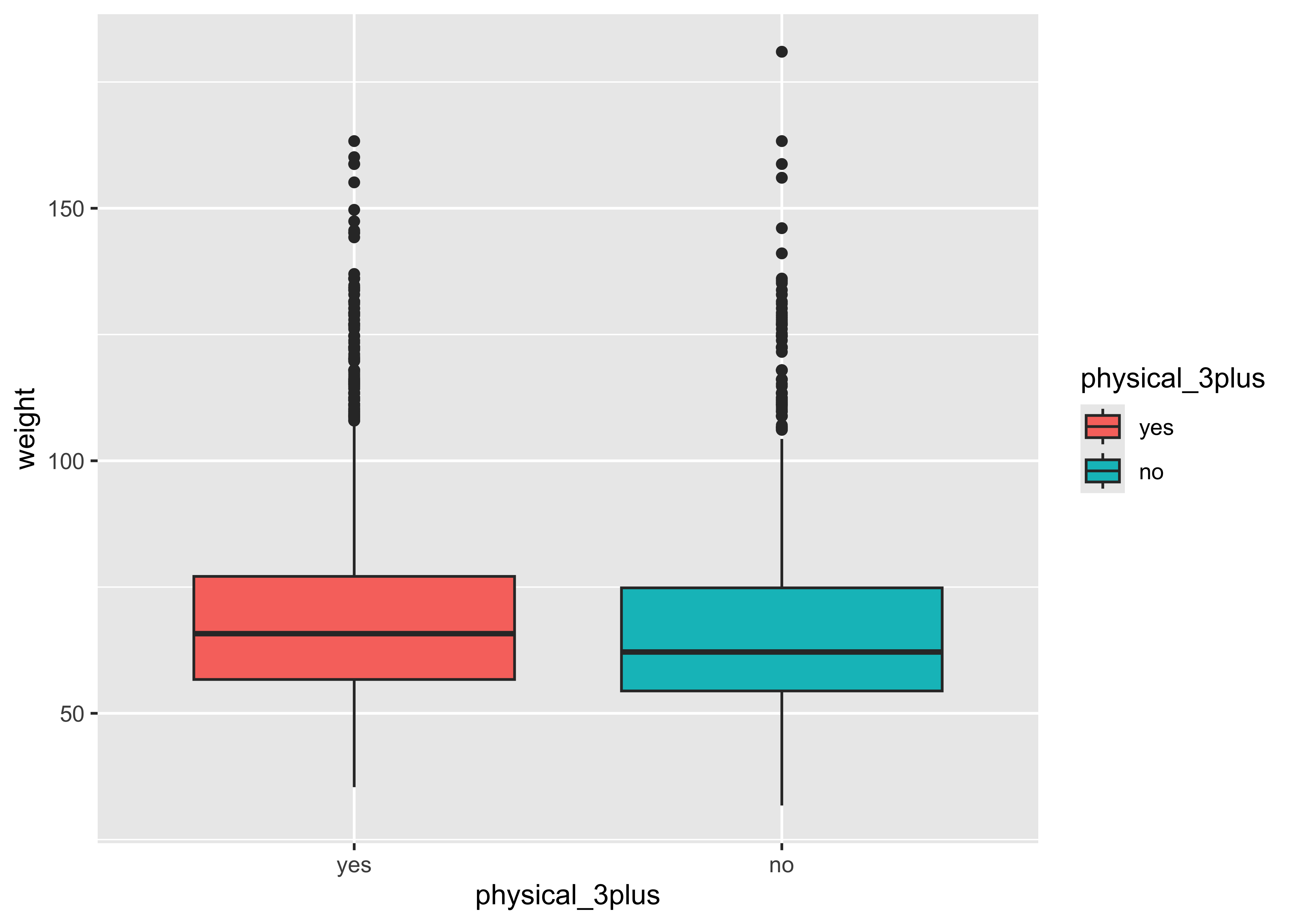 The box plots show how the medians of the two distributions compare, but we can also compare the means of the distributions using the following to first group the data by the physical_3plus variable, and then calculate the mean weight in these groups using the mean function while ignoring missing values by setting the na.rm argument to TRUE.