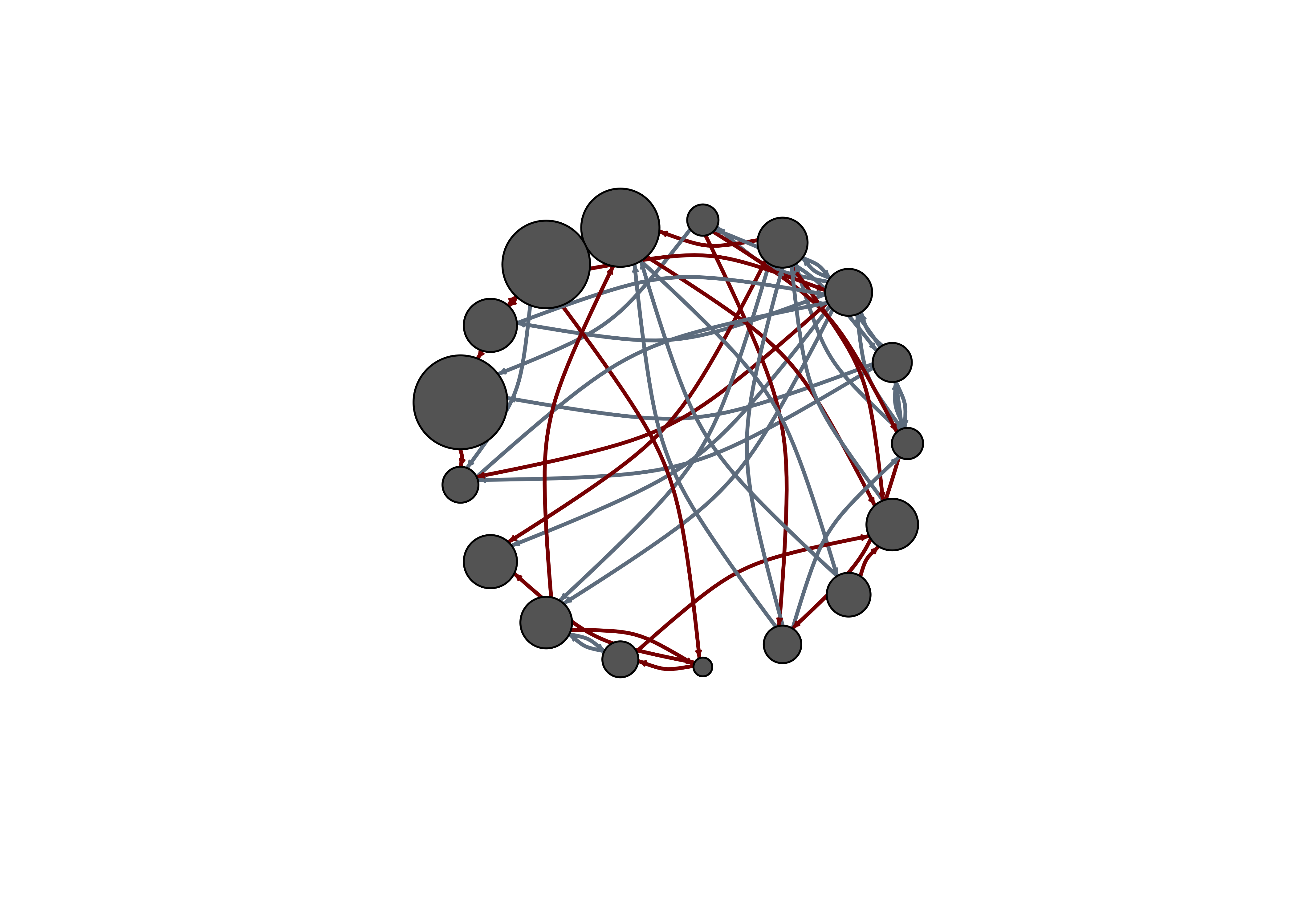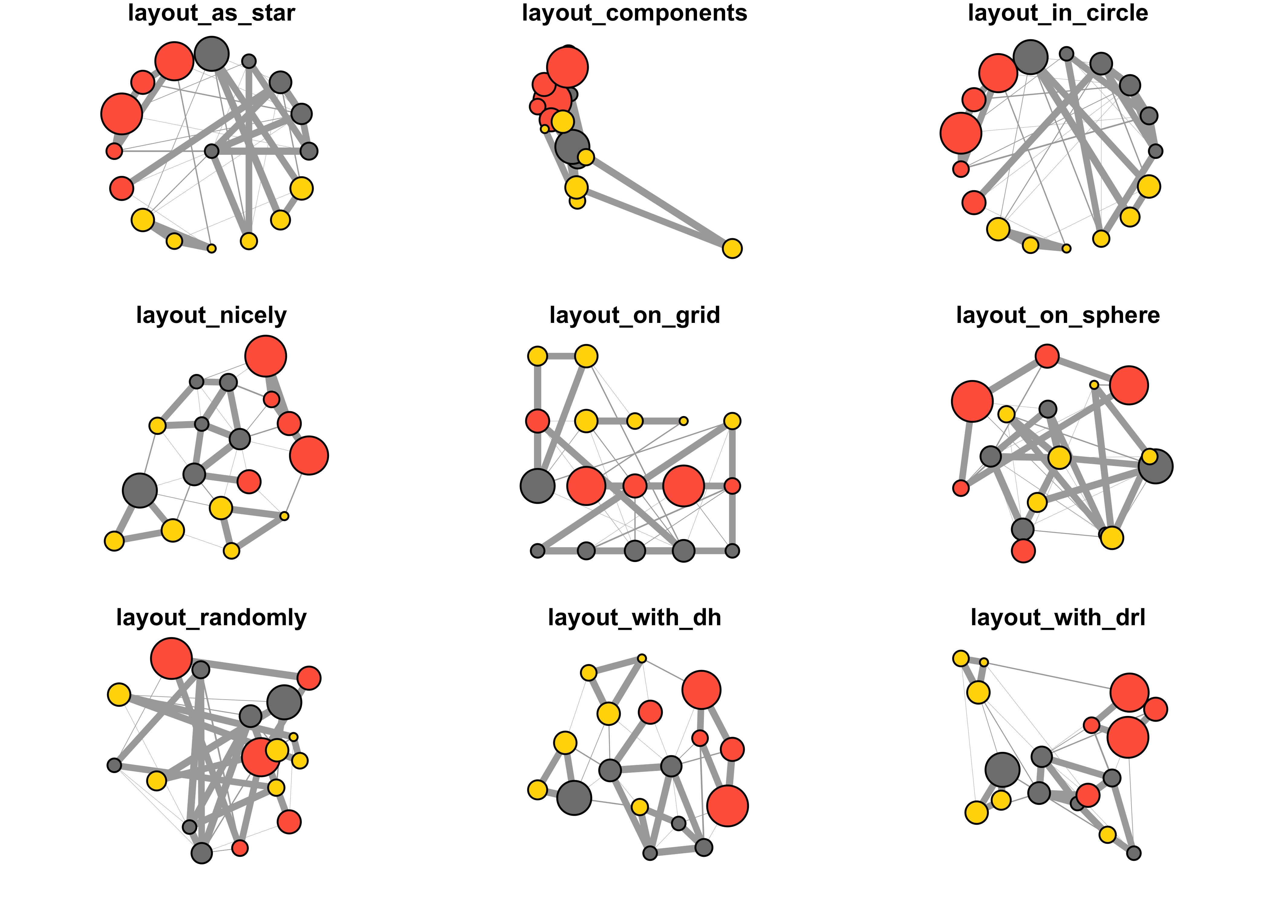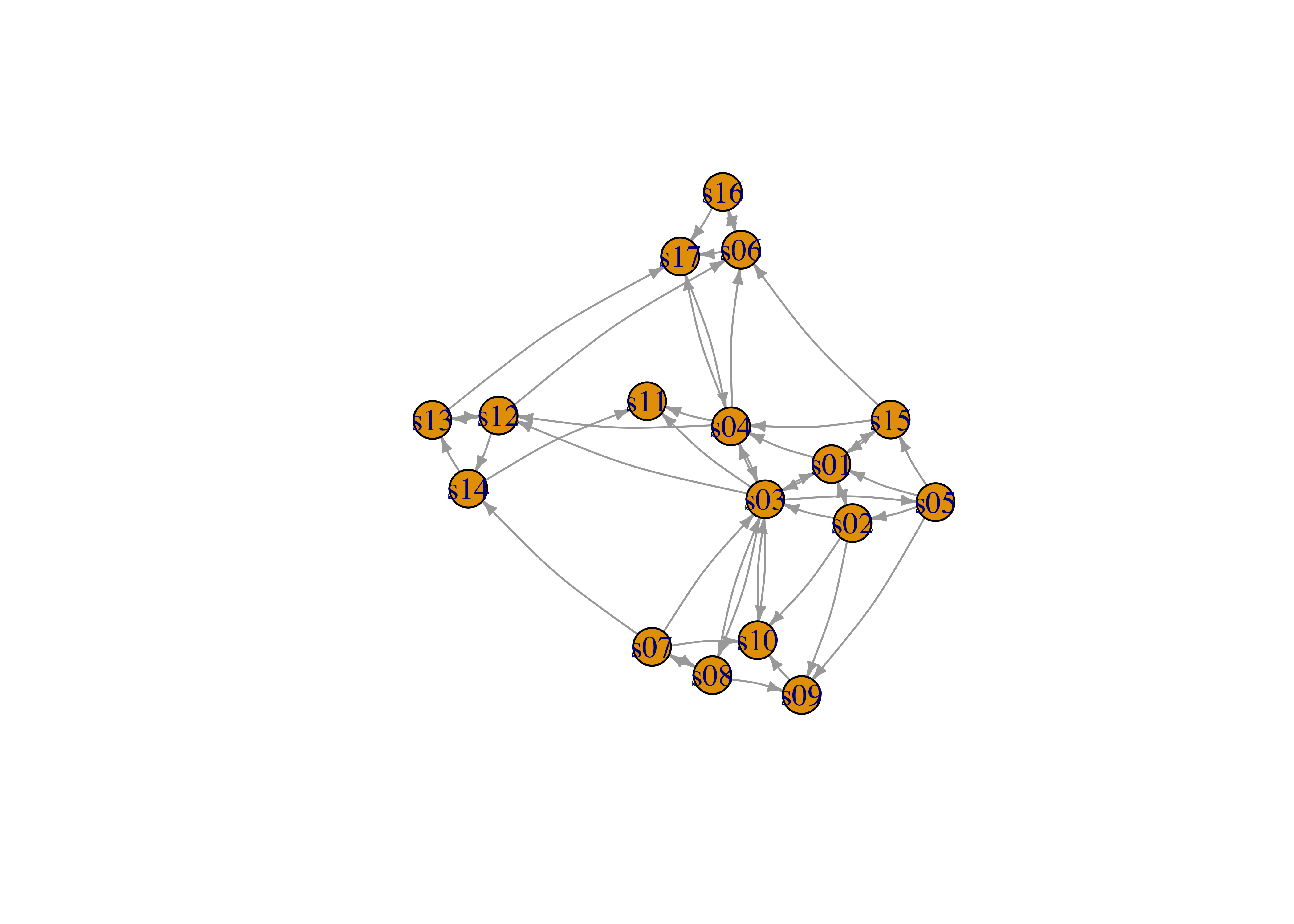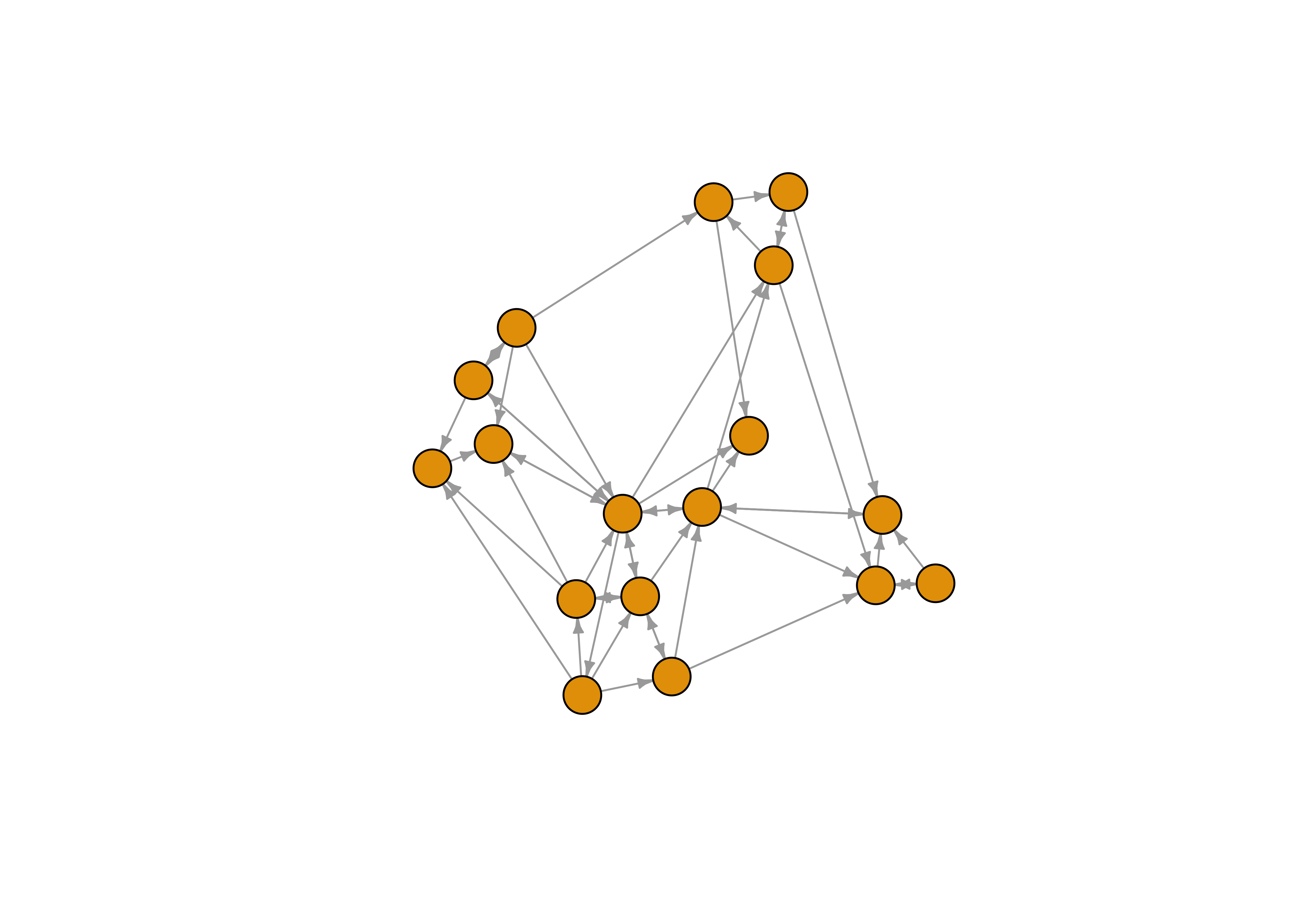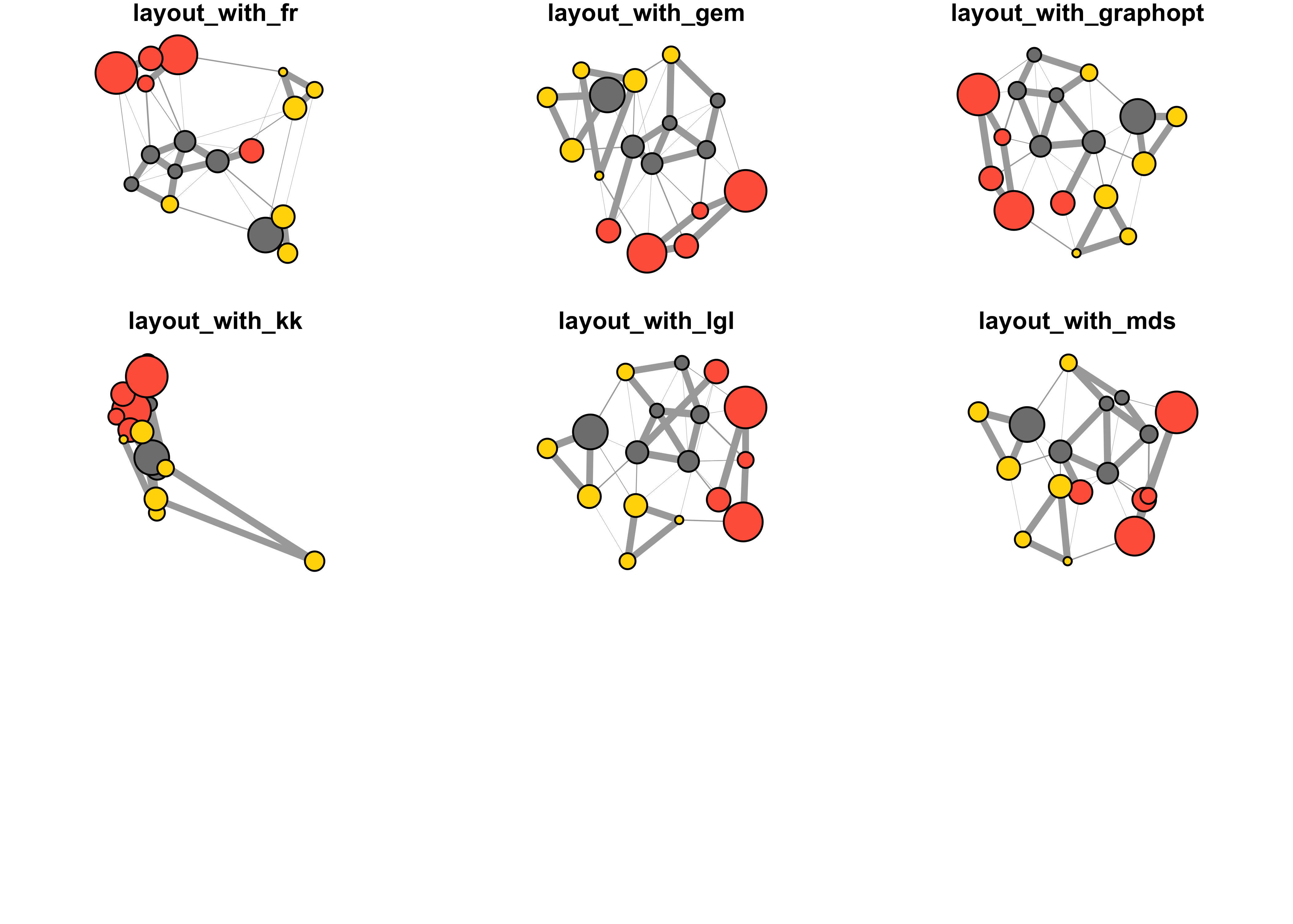 )Because all edges in the graph have the same curvature, they are drawn over each other so that we only see the last one. What we can do is assign each edge a different curvature. One useful function in ‘igraph’ called curve_multiple() can help us here. For a graph G, curve.multiple(G) will generate a curvature for each edge that maximizes visibility.