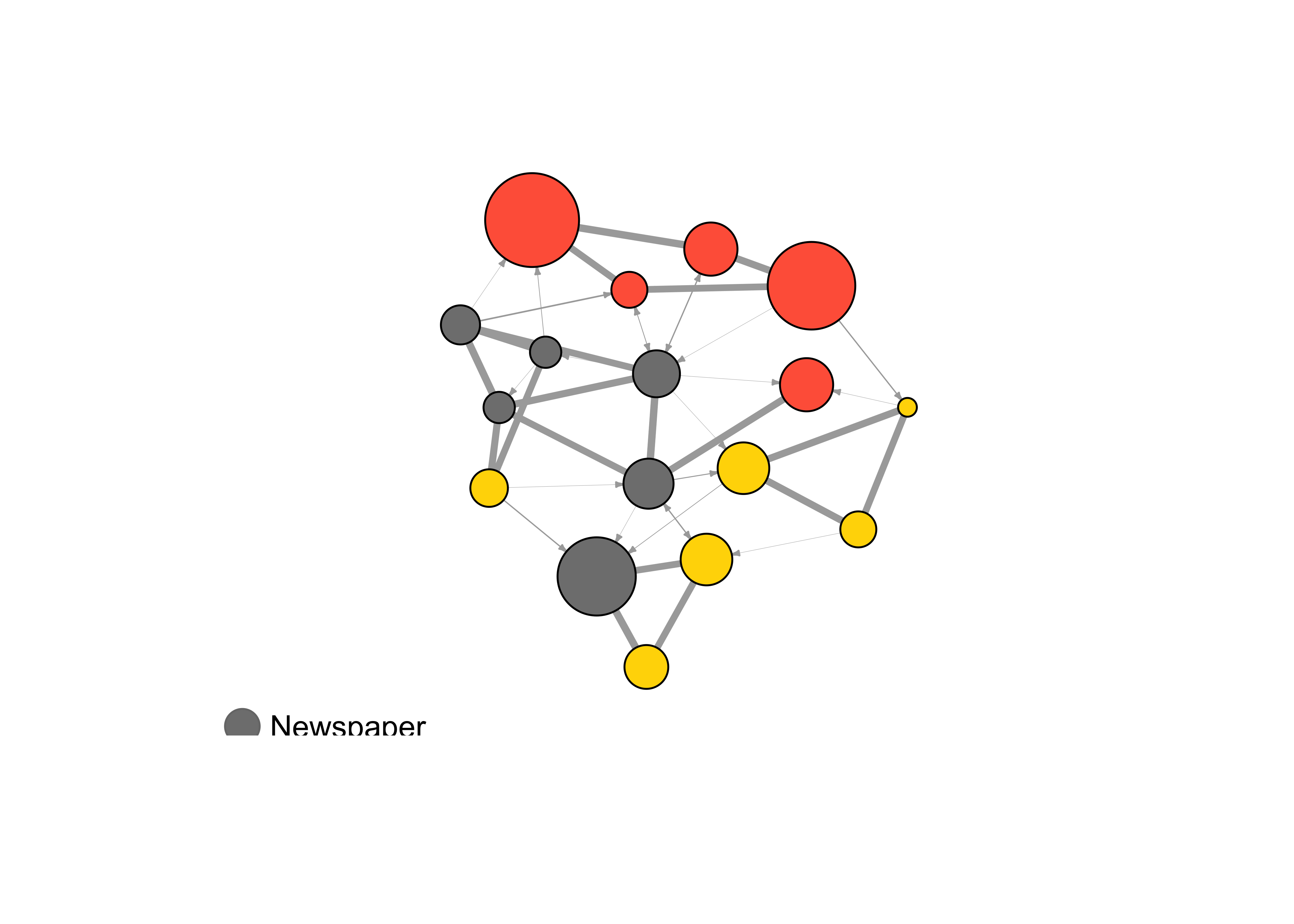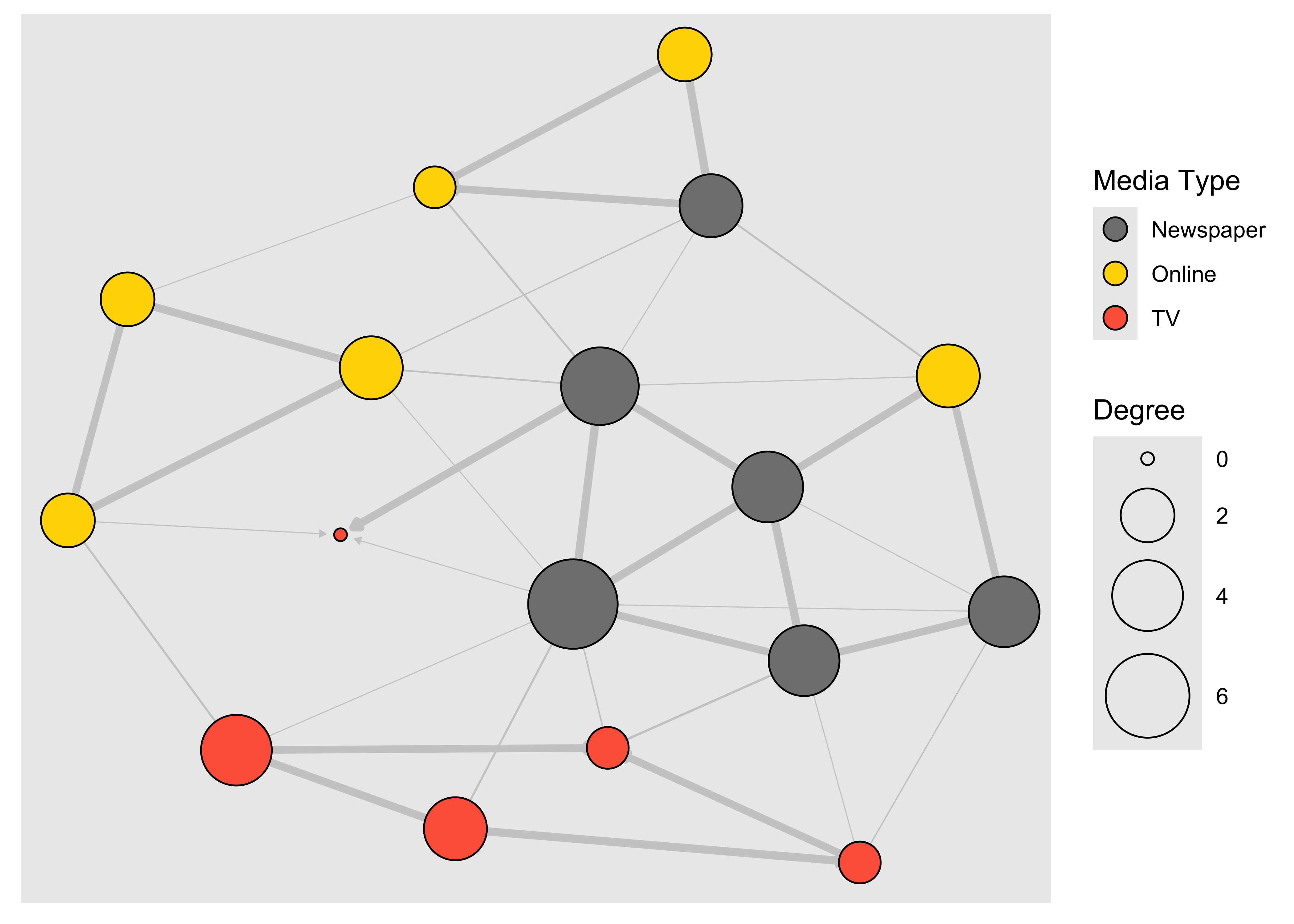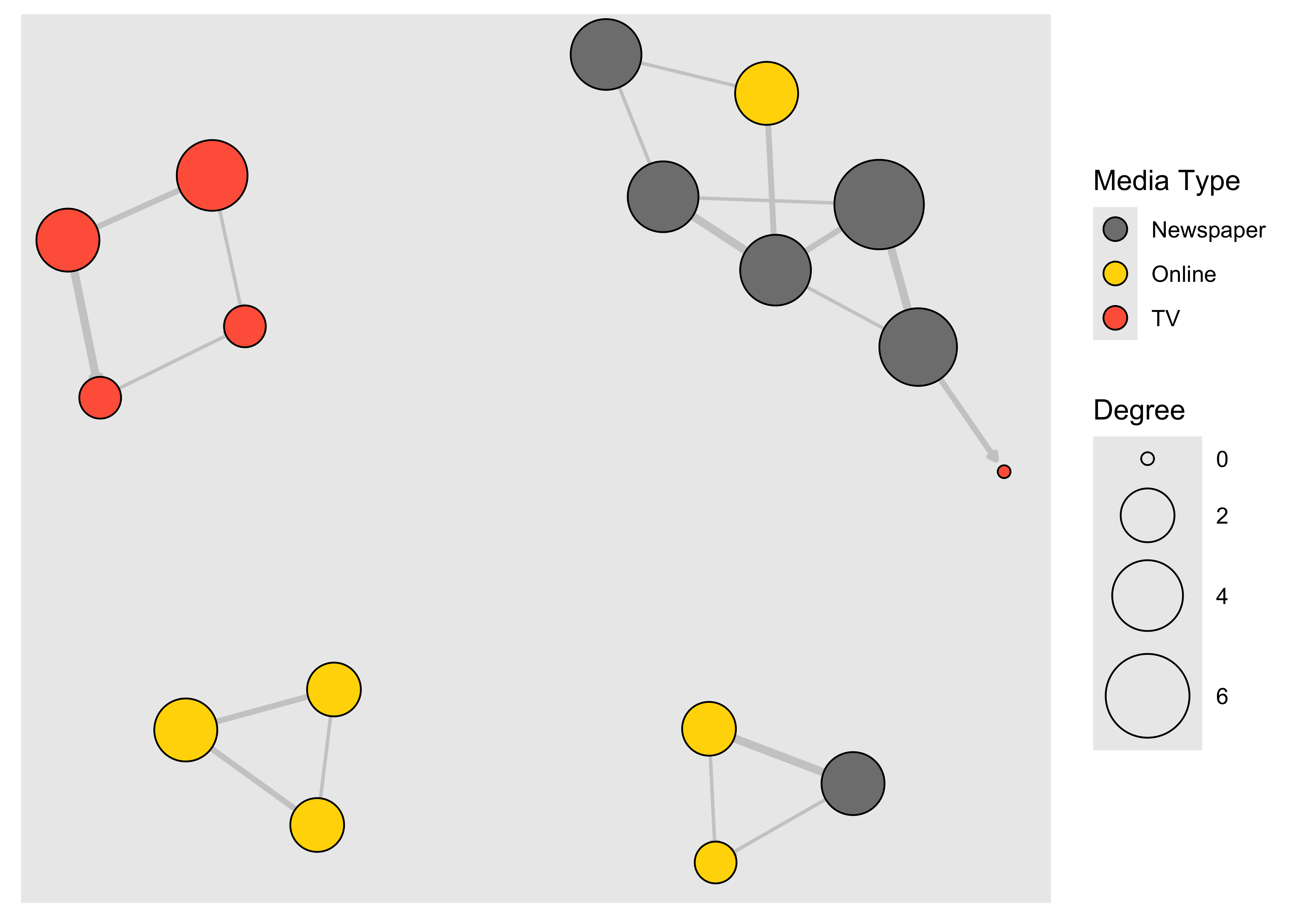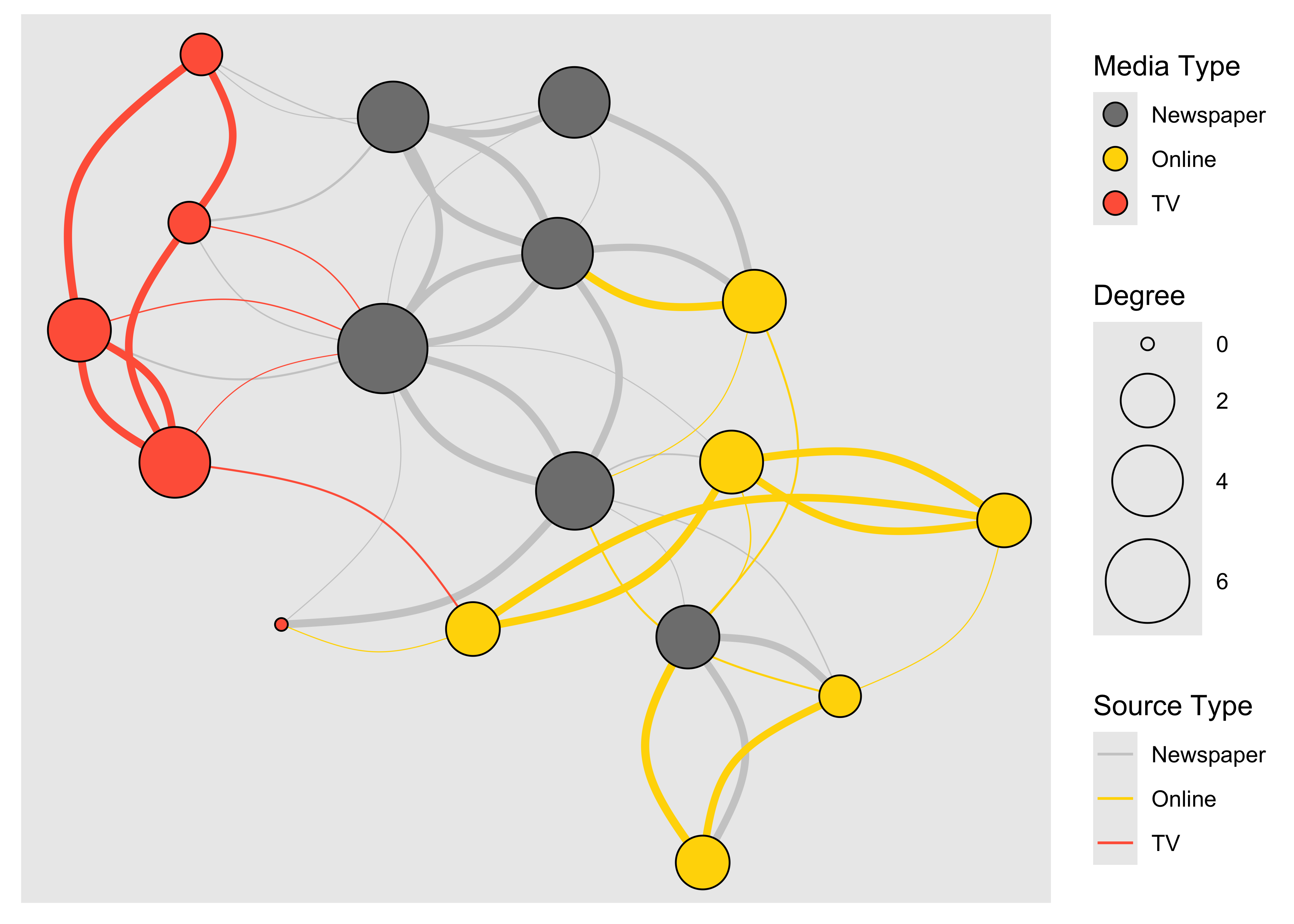 theme(legend.position = "none")In our example network, we don’t have node dyads connected by multiple types of connections (we never have both a ‘hyperlink’ and a ‘mention’ tie between the same two news outlets) – however that could happen.