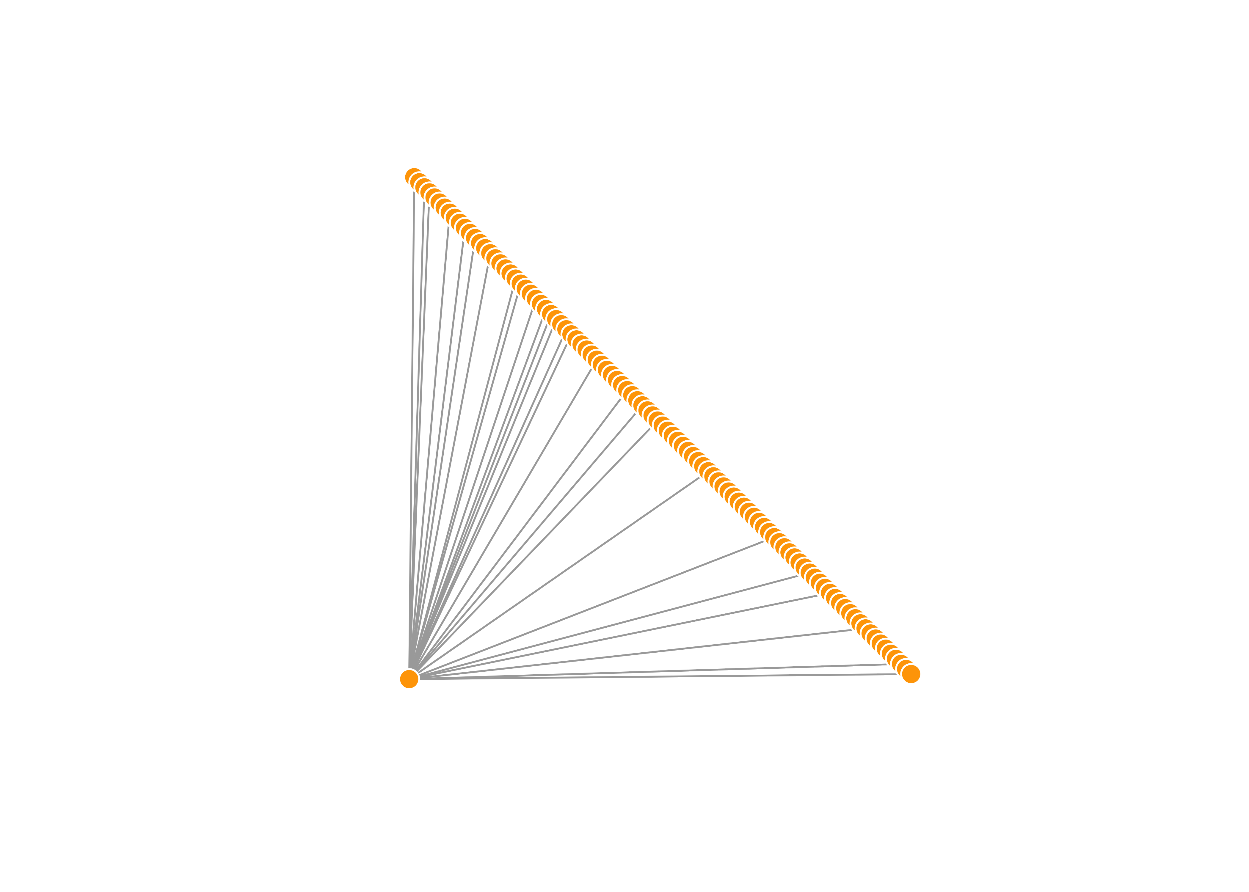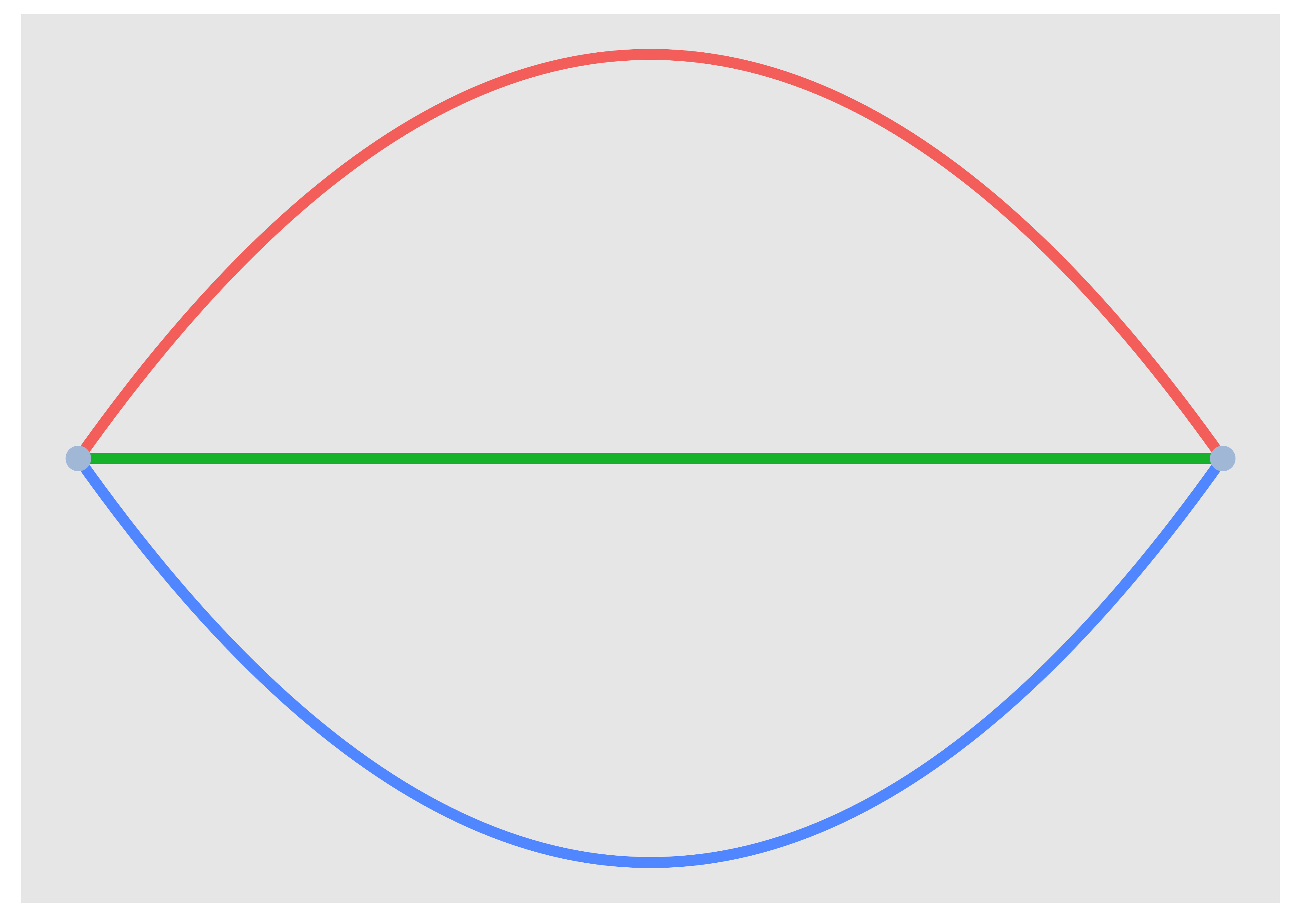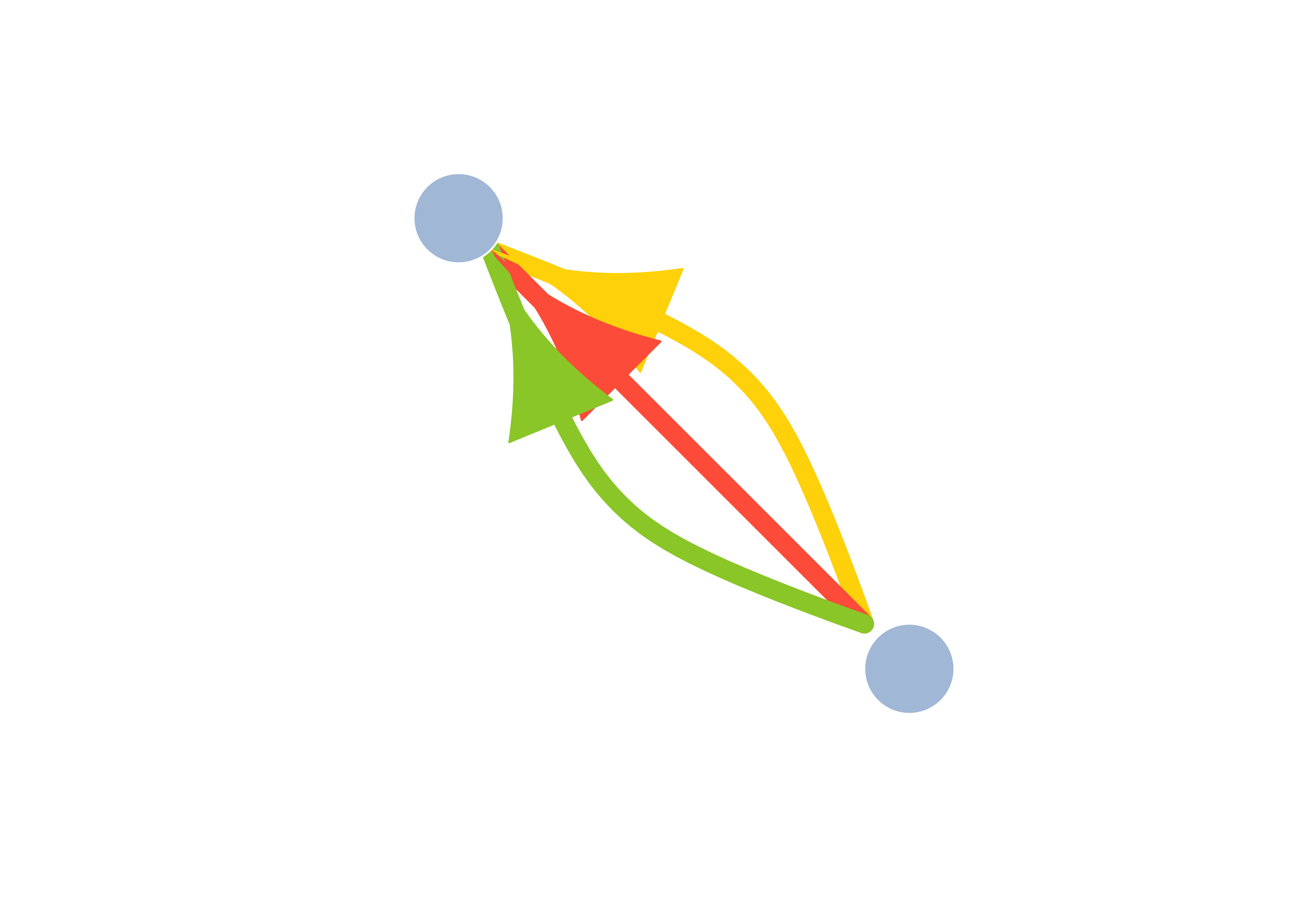 )One challenge in visualizing multiplex networks is that multiple edges between the same two nodes may get plotted on top of each other in a way that makes them impossible to distinguish. For example, let us generate a simple multiplex network with two nodes and three ties between them:
