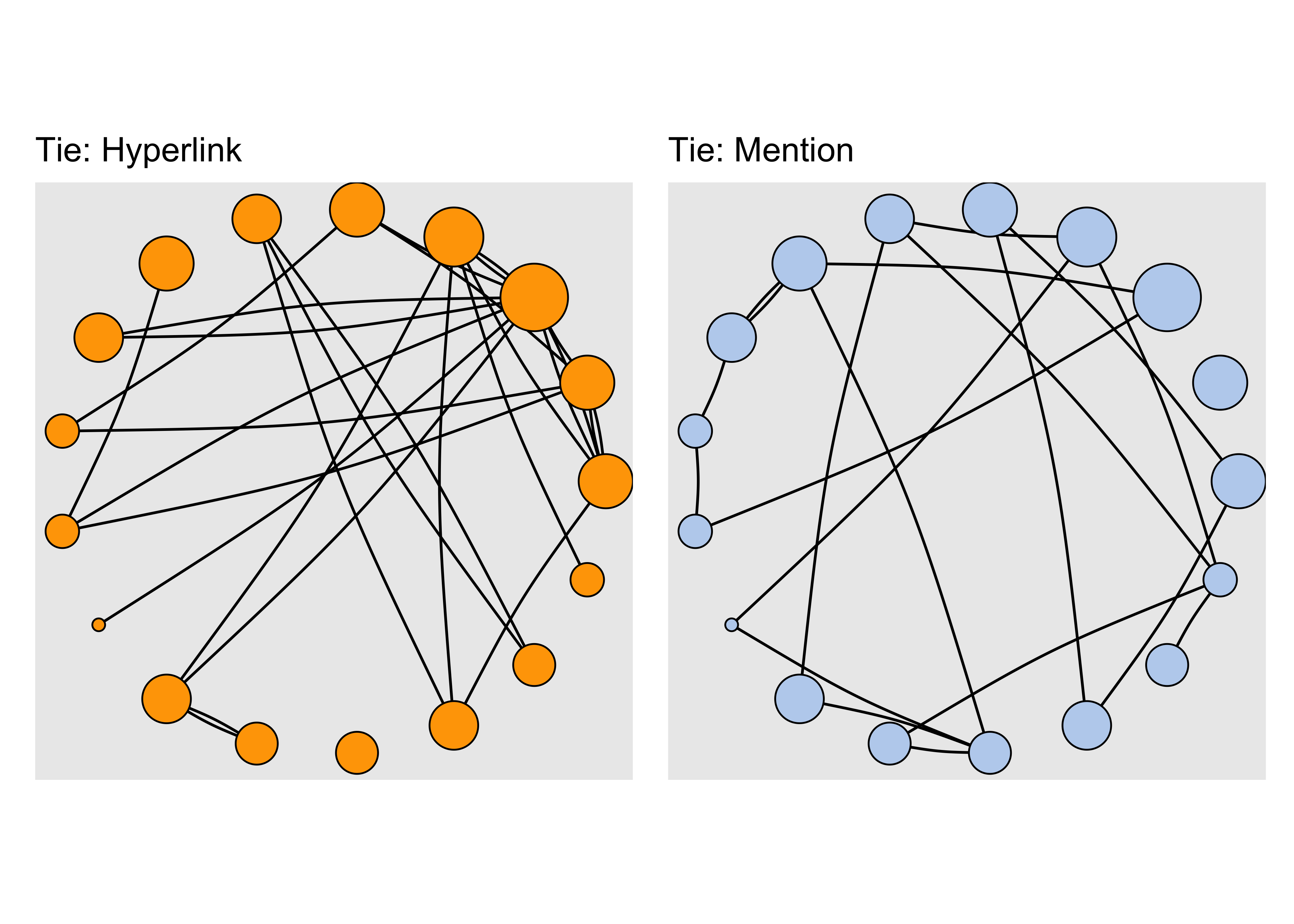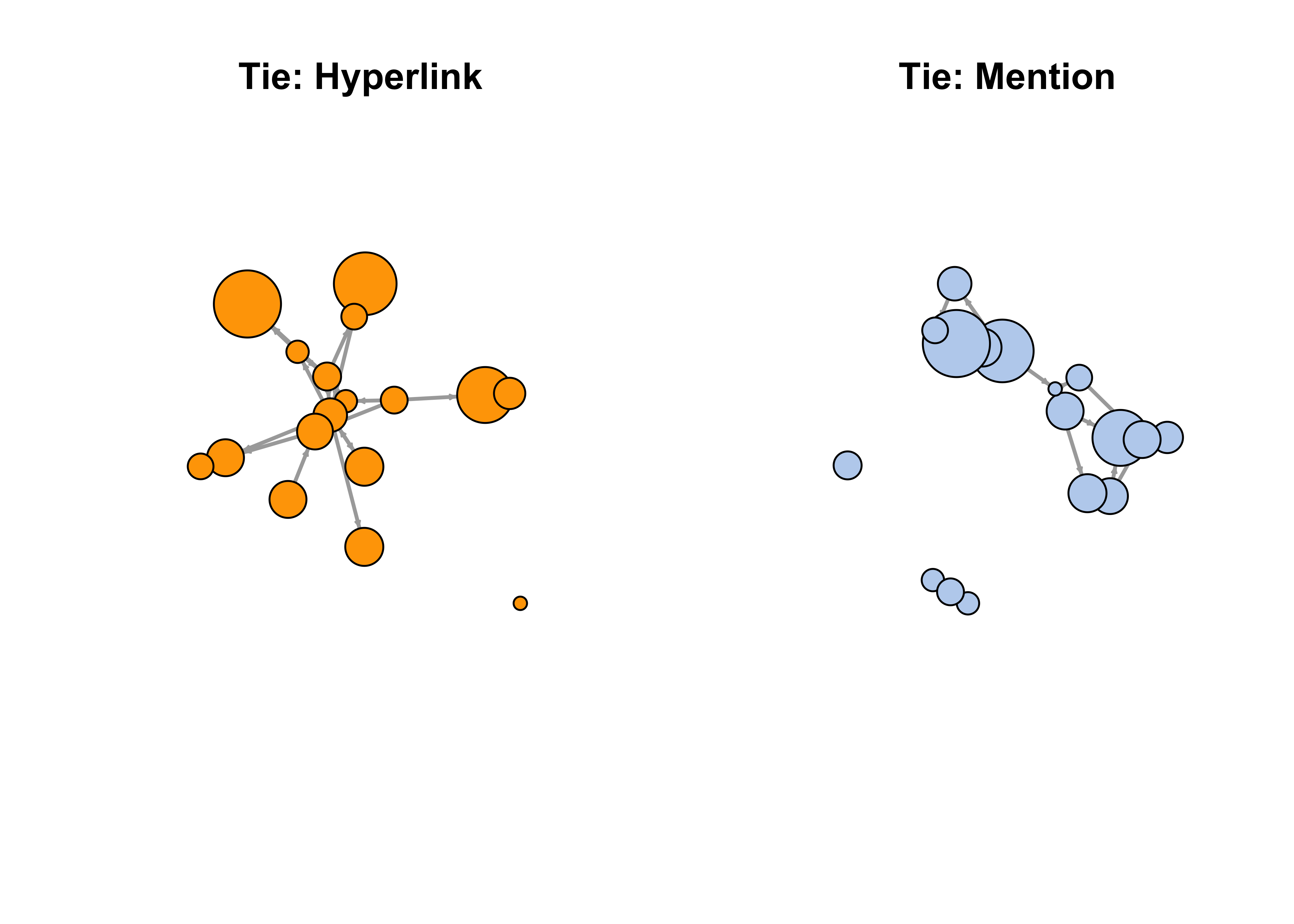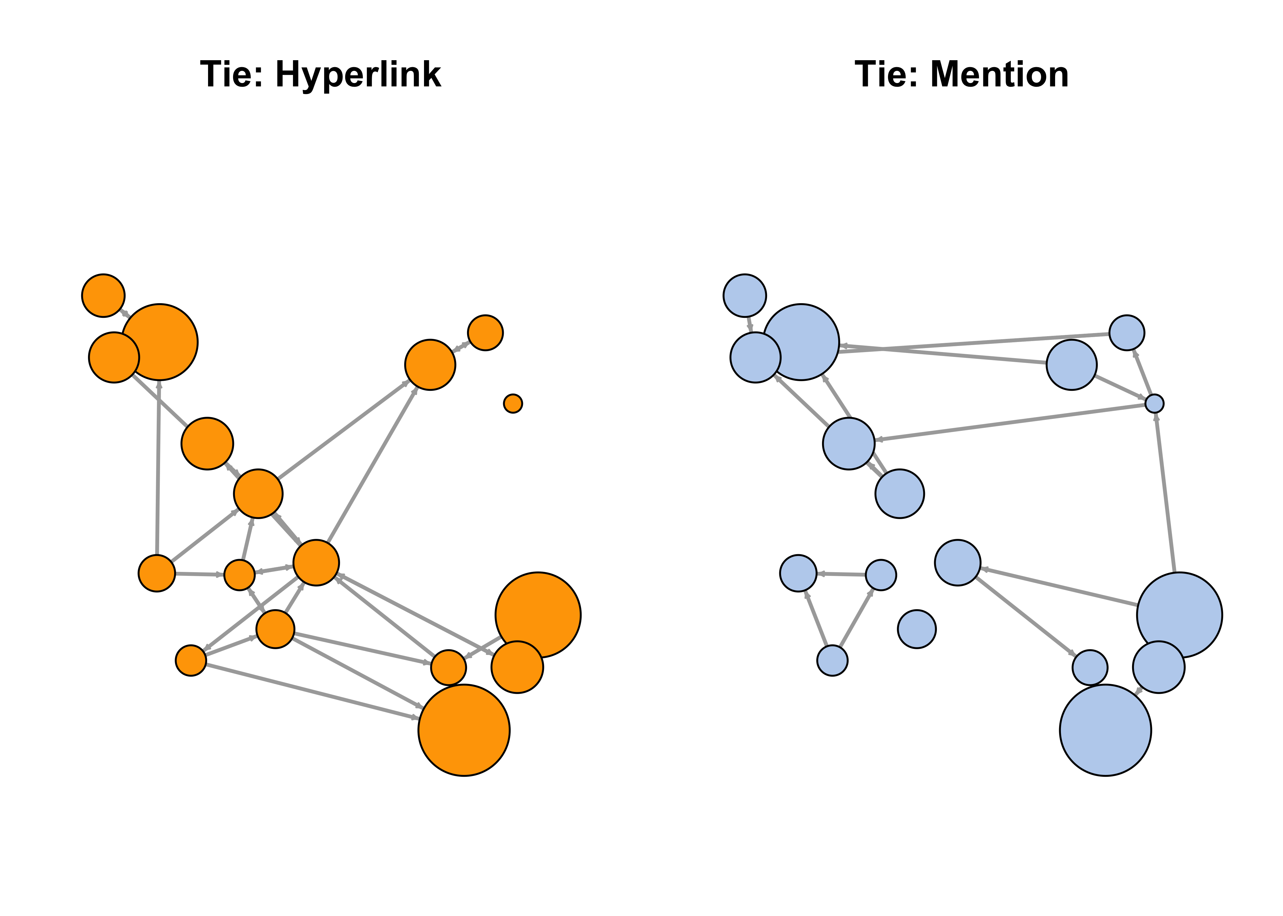 In our example network, we also have two tie types: hyperlinks and mentions. One thing we can do is plot each type of tie separately: