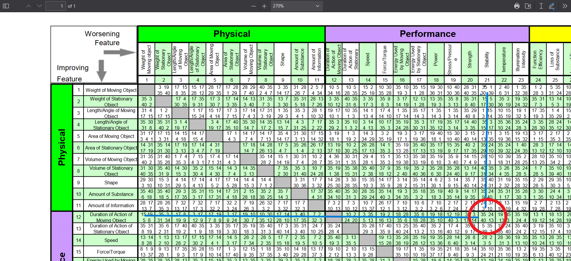 Let us take the both the TC-s into the Contradiction Matrix and arrive at the list of TRIZ Inventive Principles. Here is the Matrix solution for TC-1 in the figure below: