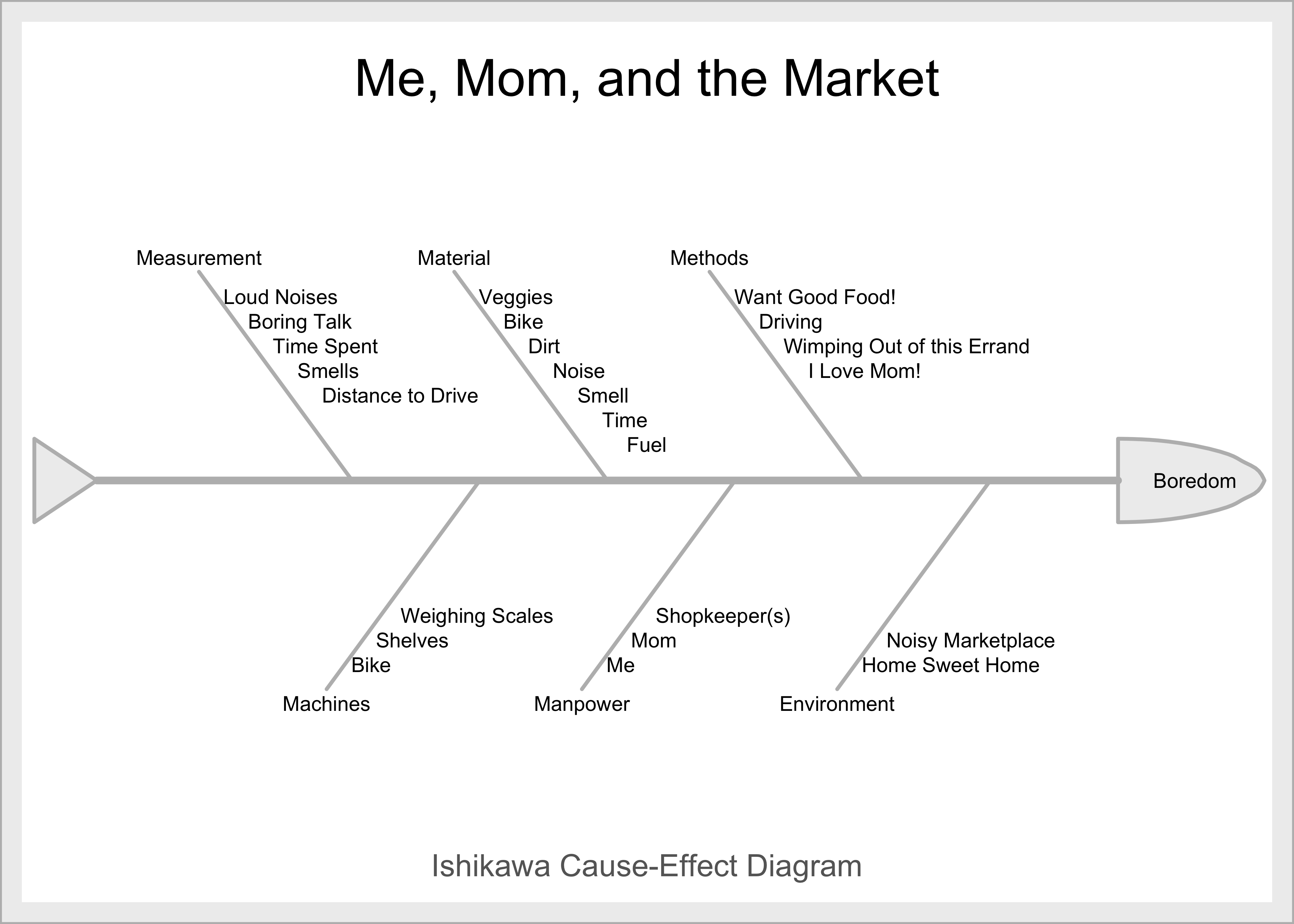 Turning the knobs/parameters in the Ishikawa Diagram, it seems that if the YM goes to the market with Mom, he would most likely get bored, but would please Mom. If he doesn’t go, then he chills at home, but Mom is going to justifiably furious. Herein lies the Contradiction, which we can now specify as an Administrative Contradiction(AC) in plain English: