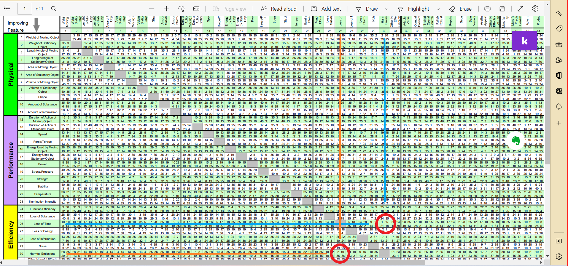 Let us take the both the TC-s into the Contradiction Matrix and arrive at the list of TRIZ Inventive Principles. Here is the Matrix solution for TC-1 in the figure below: